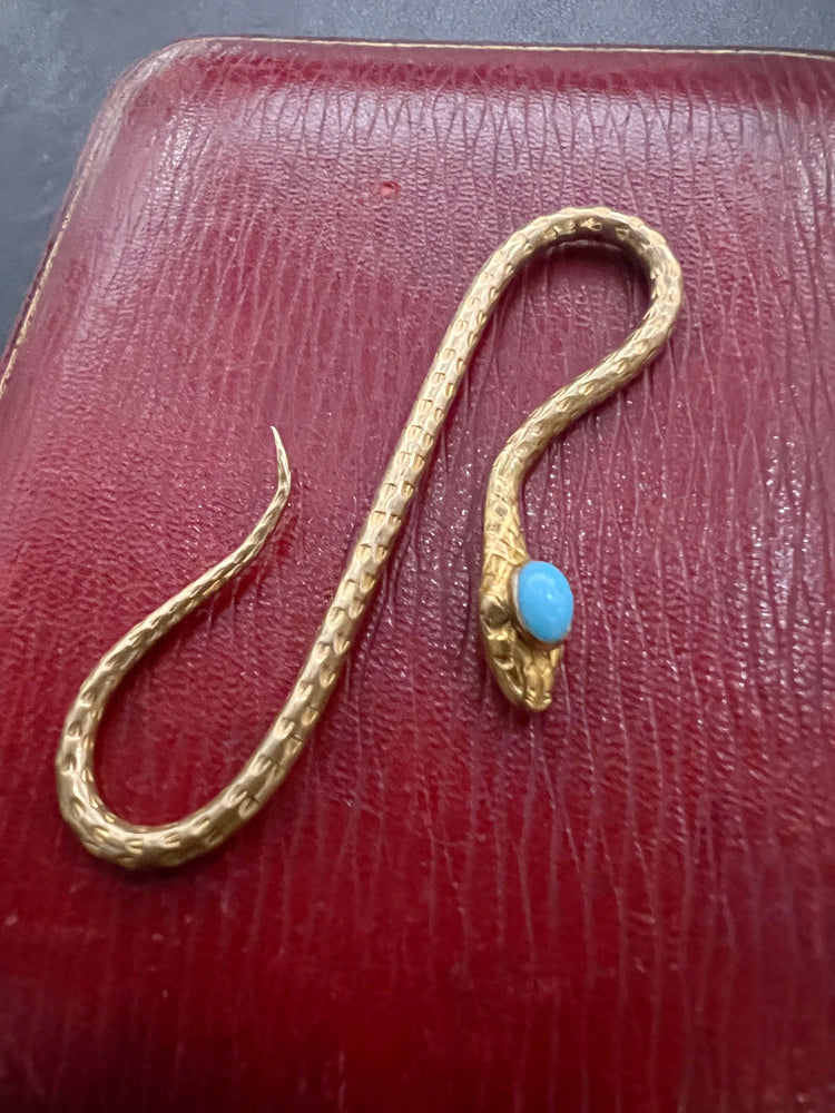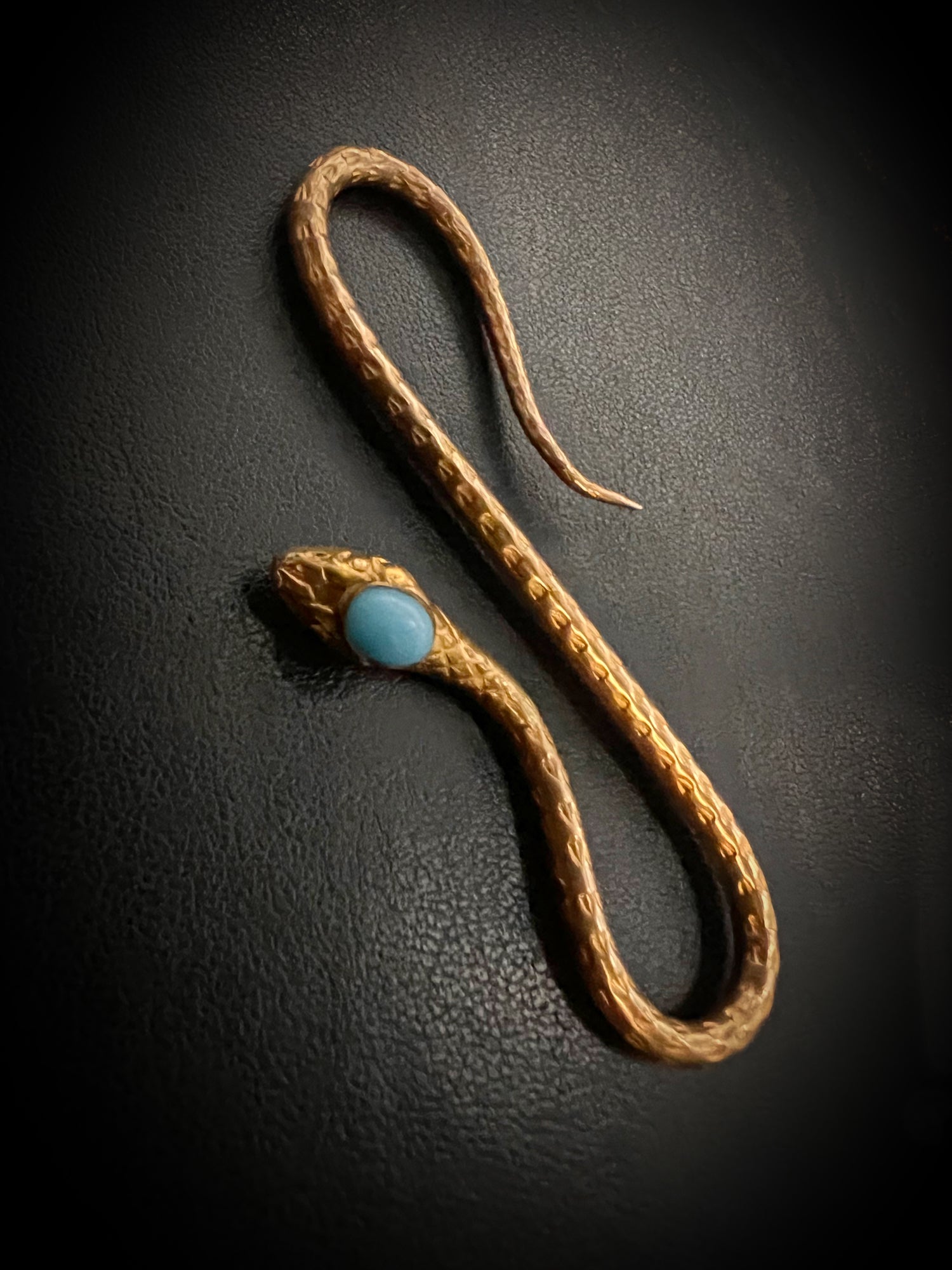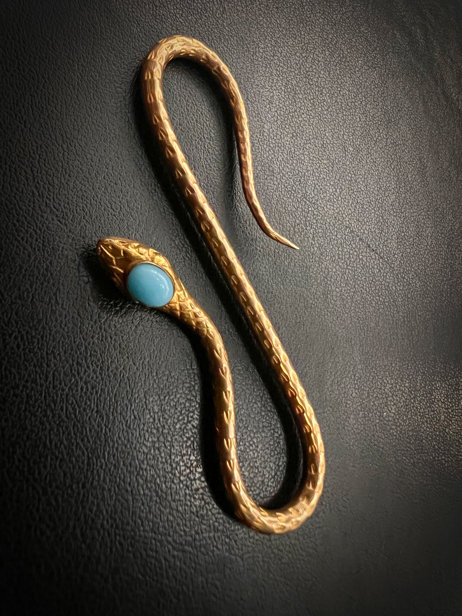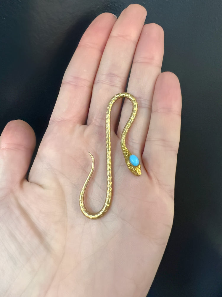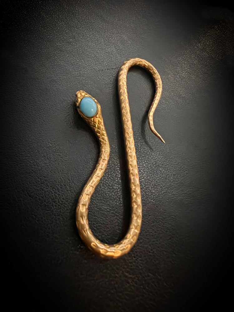 This is a super sized snake made of chased base metal with a large cabochon glass turquoise in the snakes head!