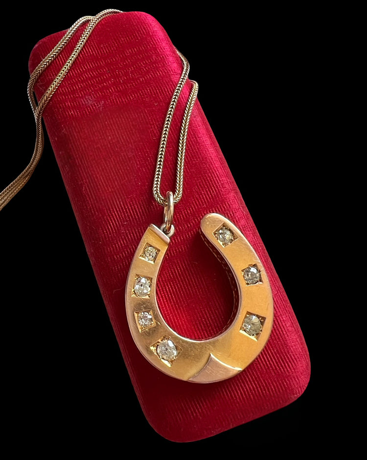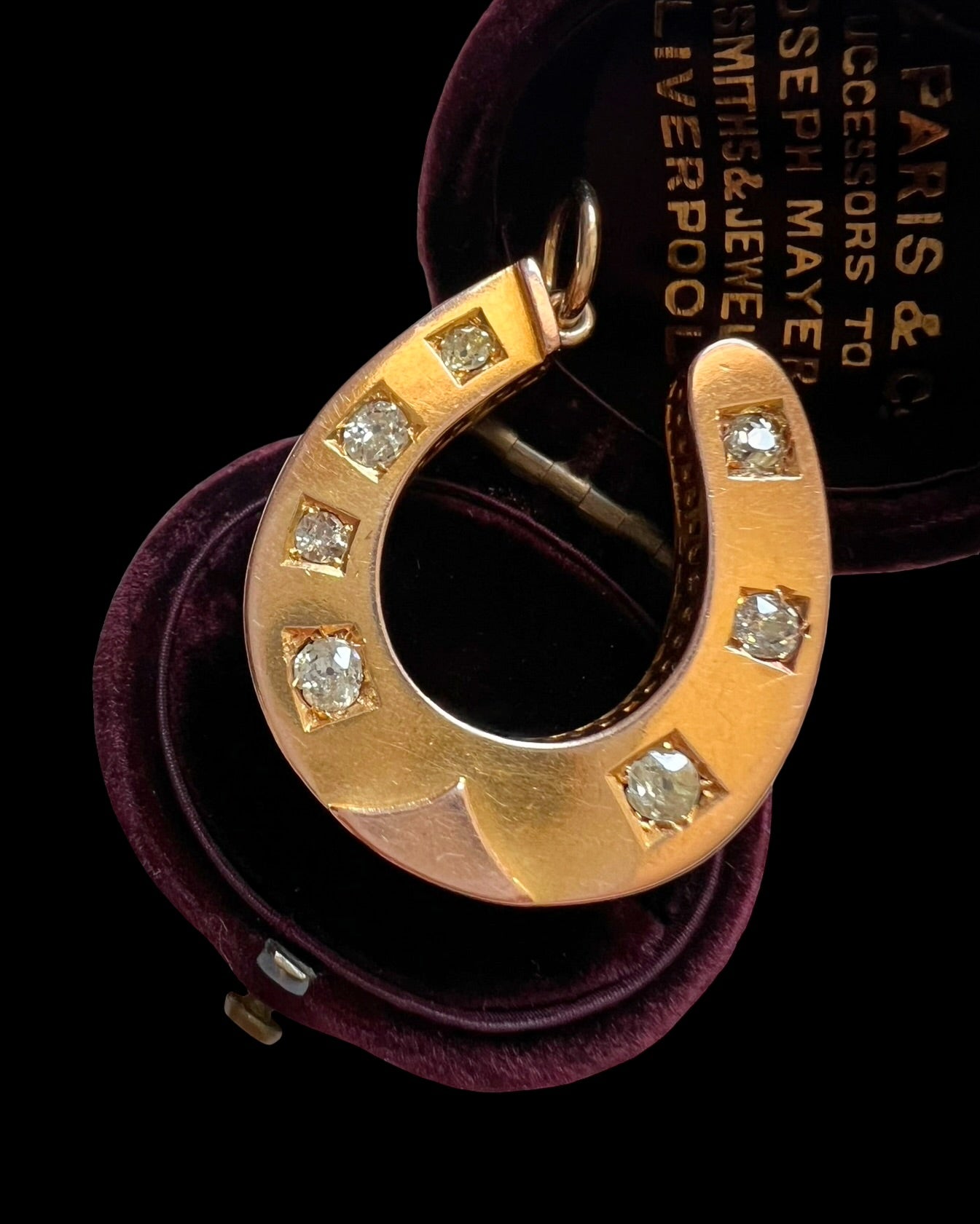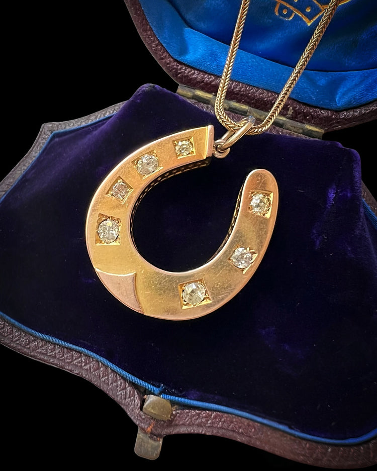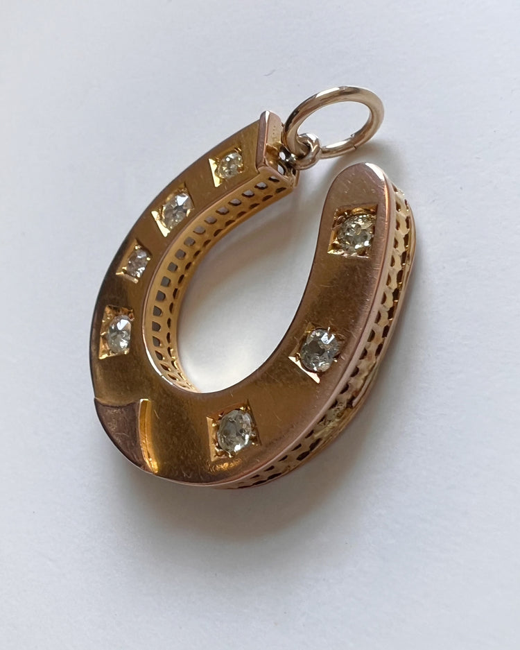 A supersized, super chunky, Victorian 18ct gold horseshoe pendant, set with seven old cut diamonds.