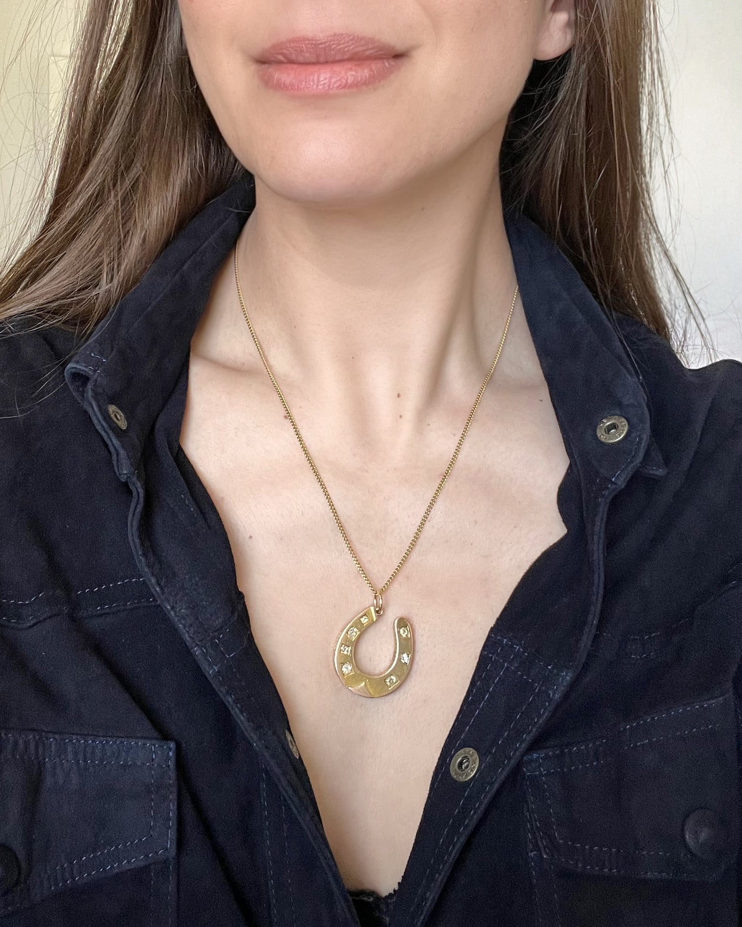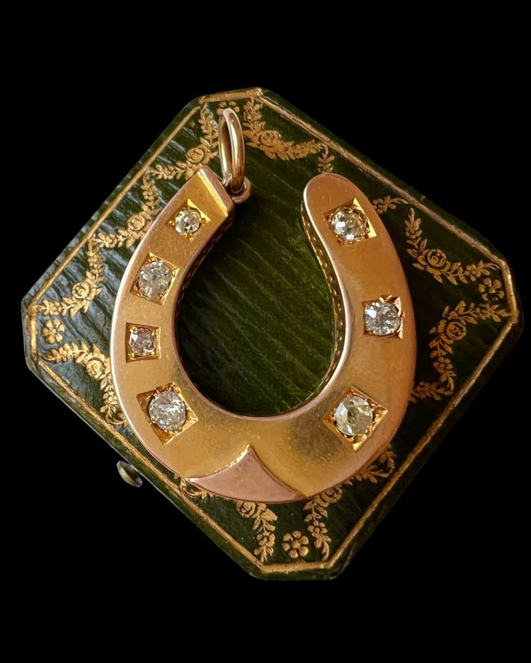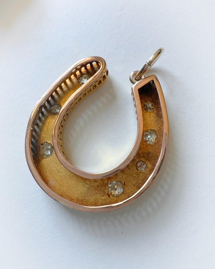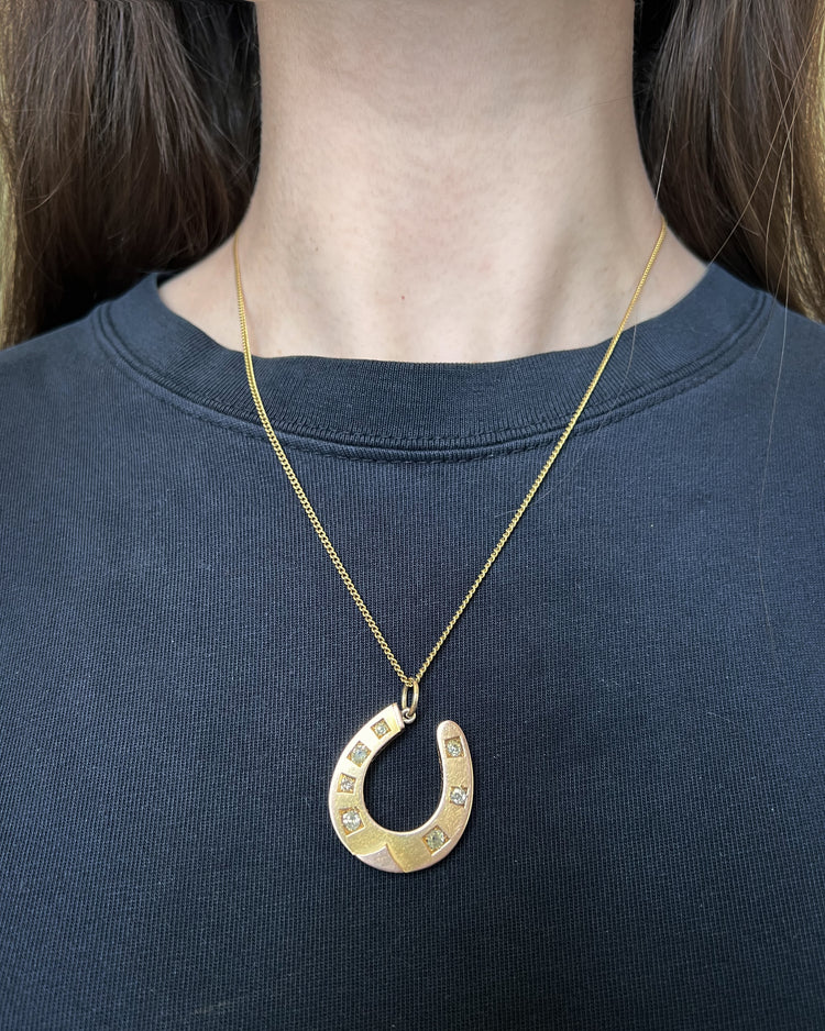 A supersized, super chunky, Victorian 18ct gold horseshoe pendant, set with seven old cut diamonds.