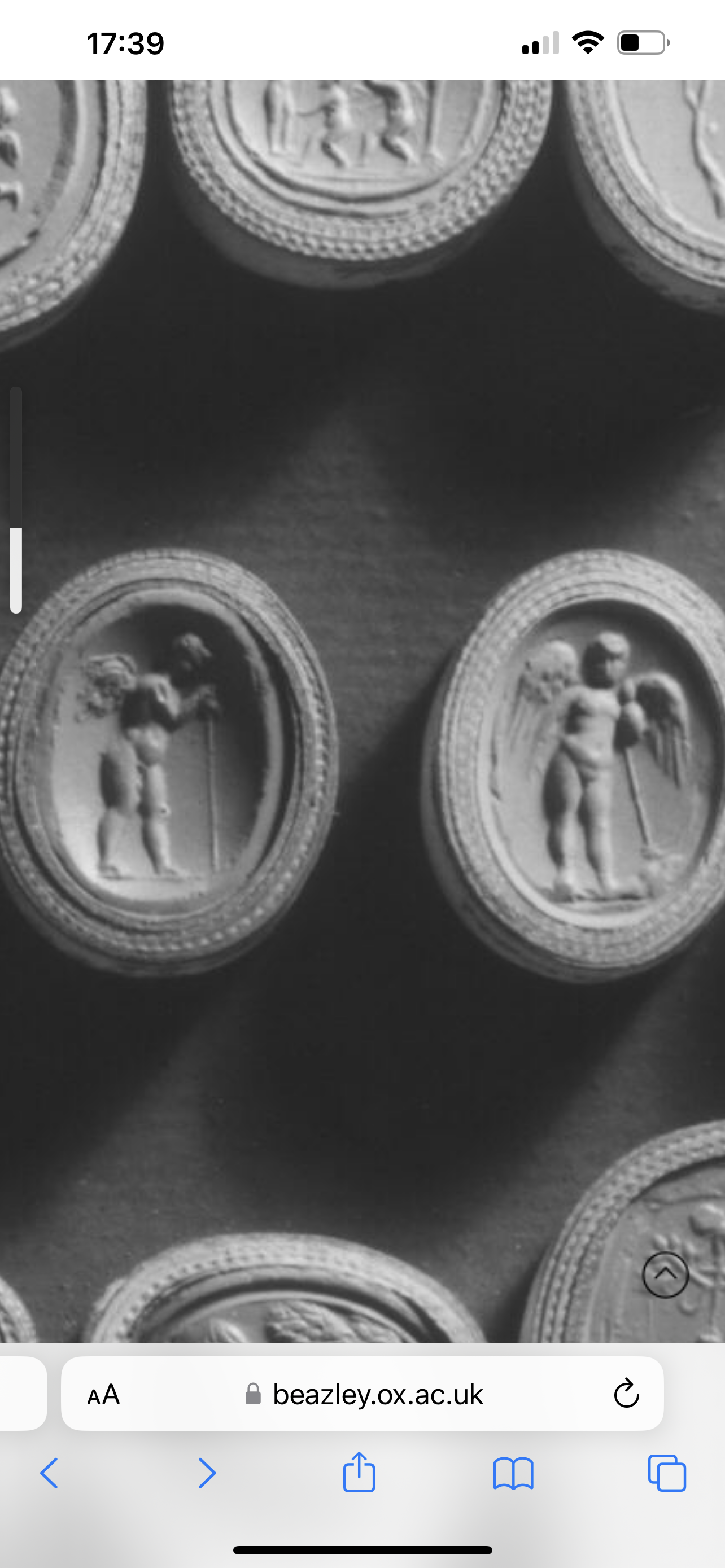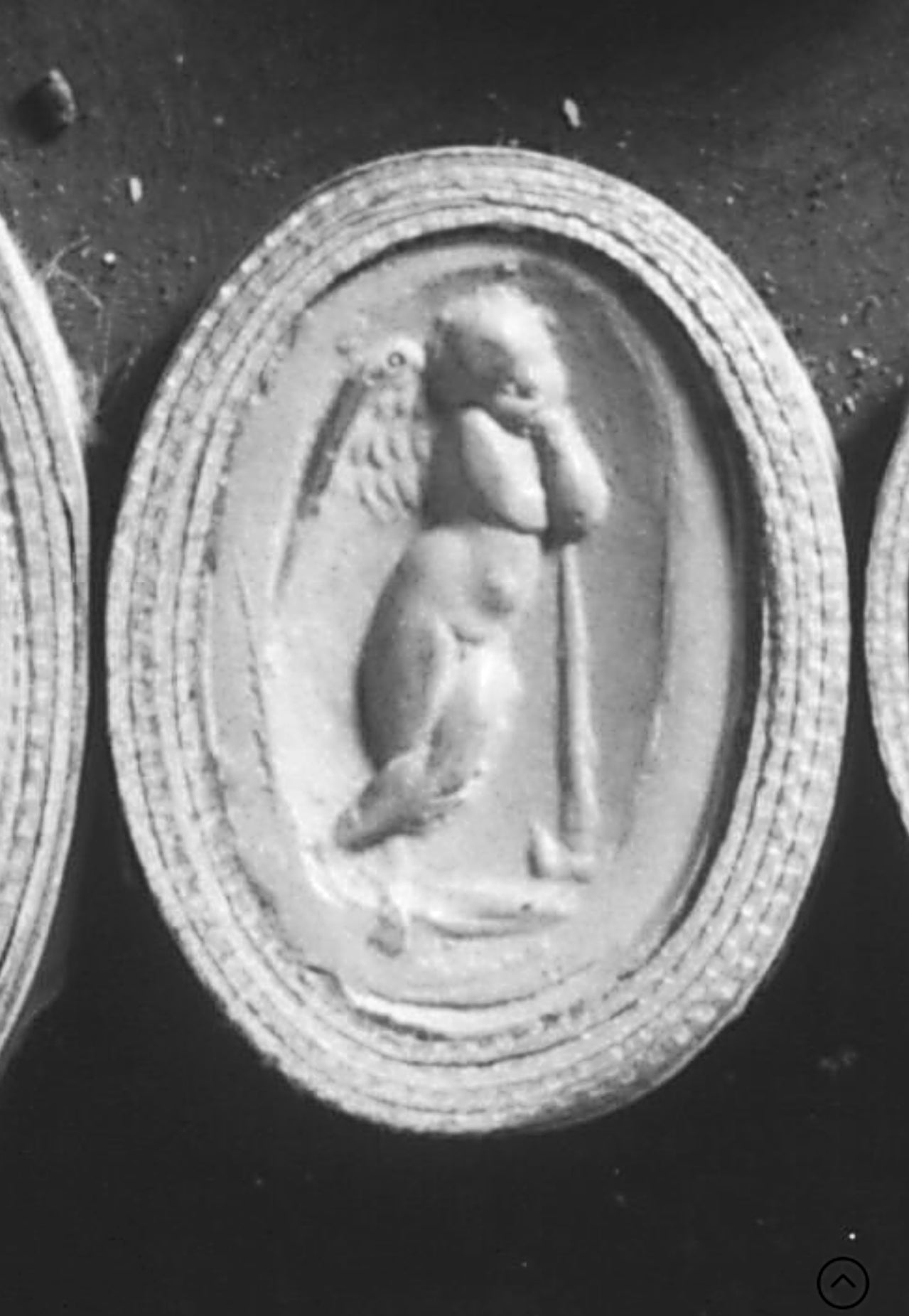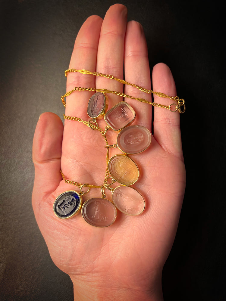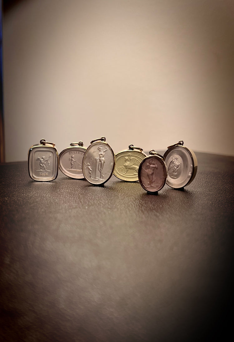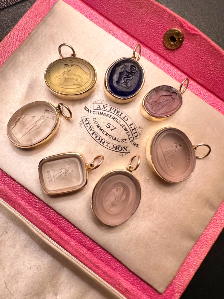 The intaglio has been set in a very simple 9ct gold setting, to allow the story of the piece to take centre stage.
