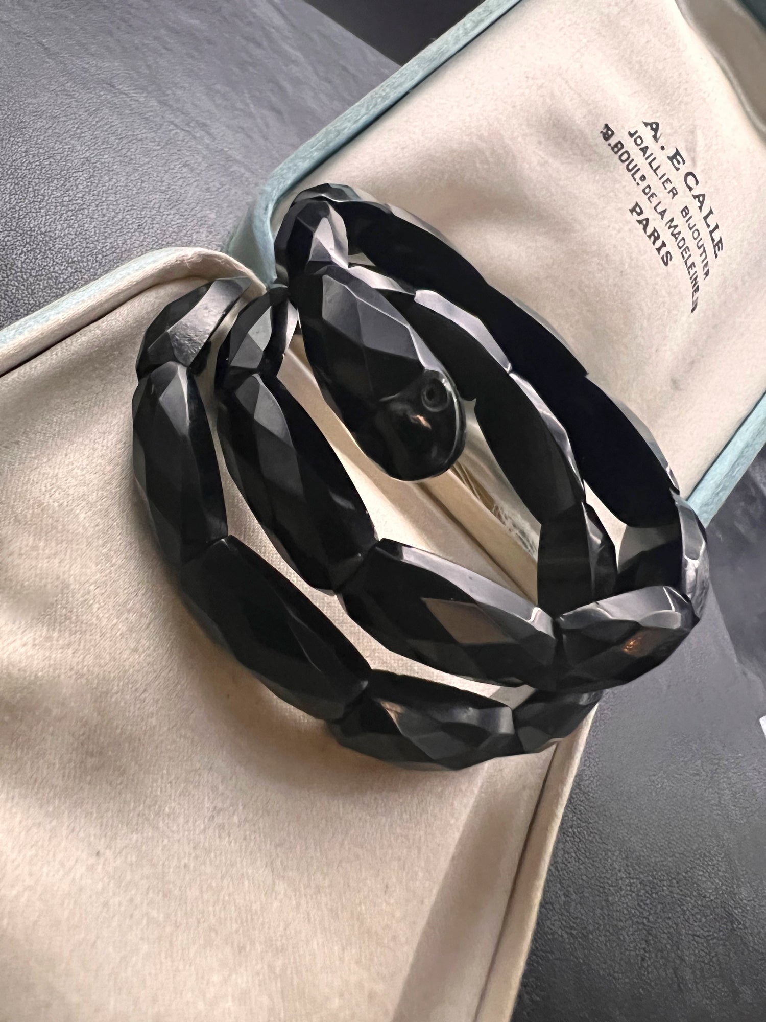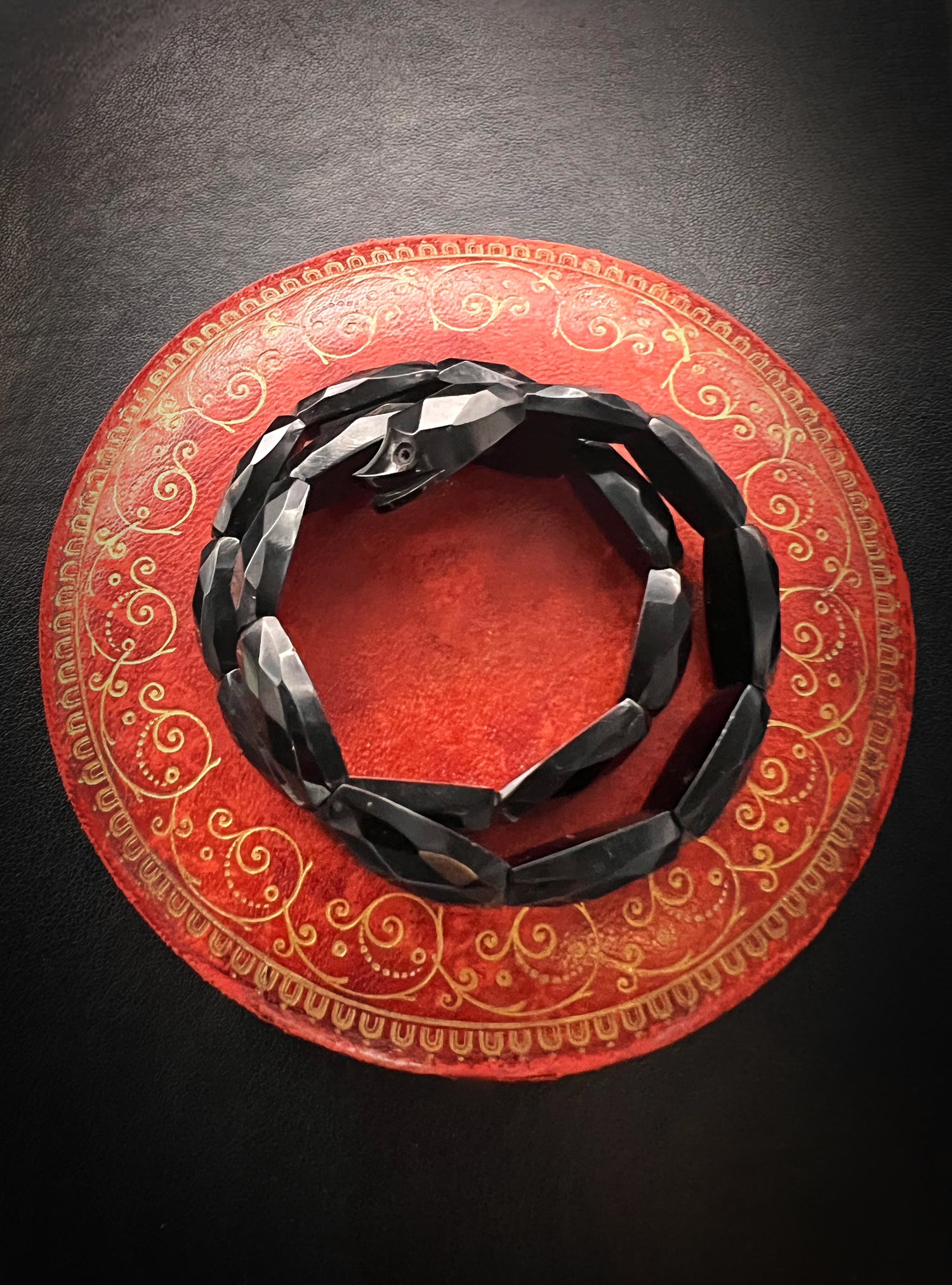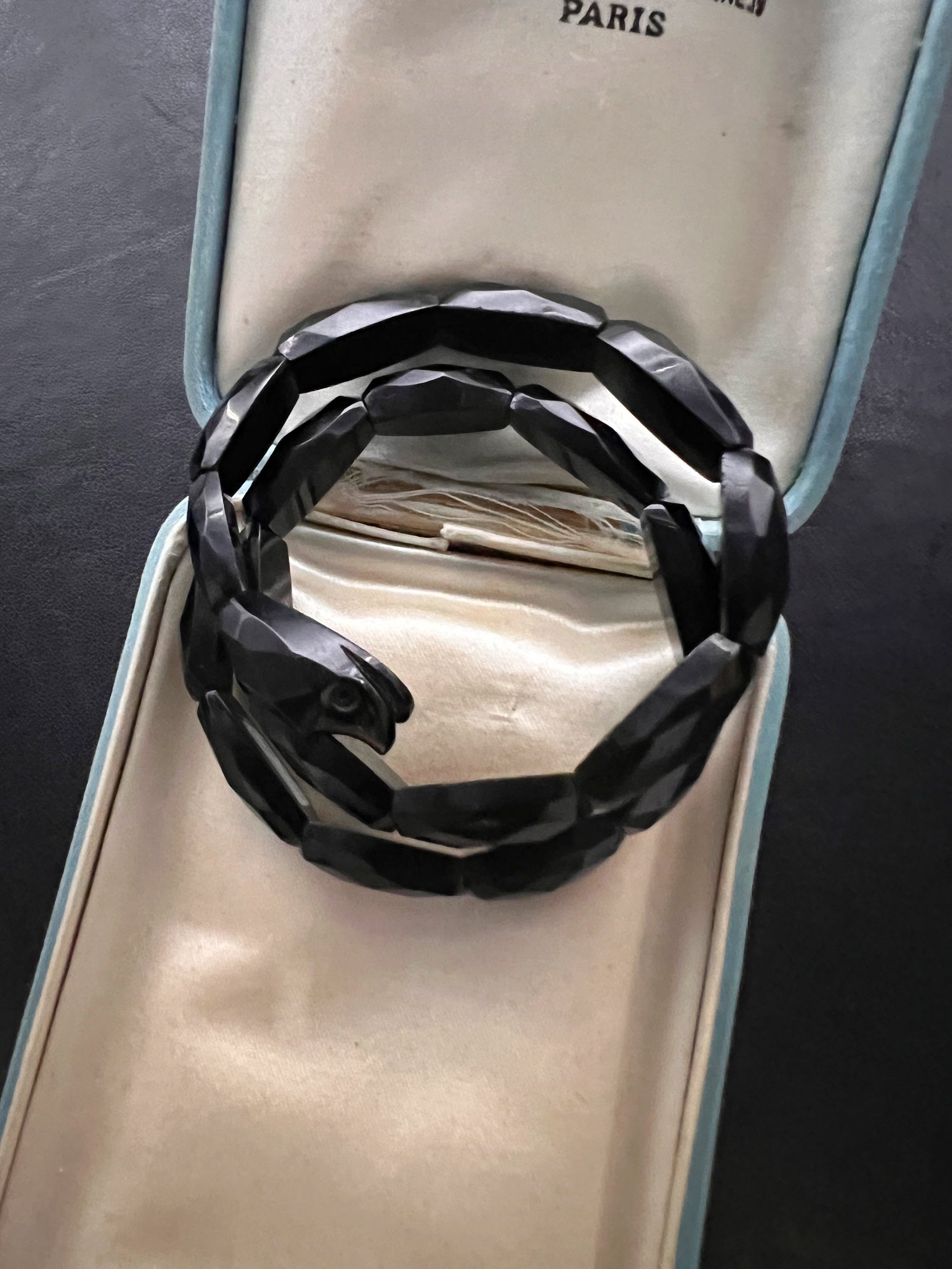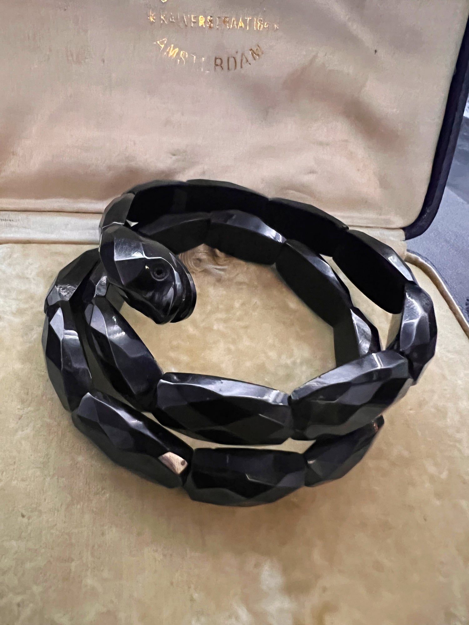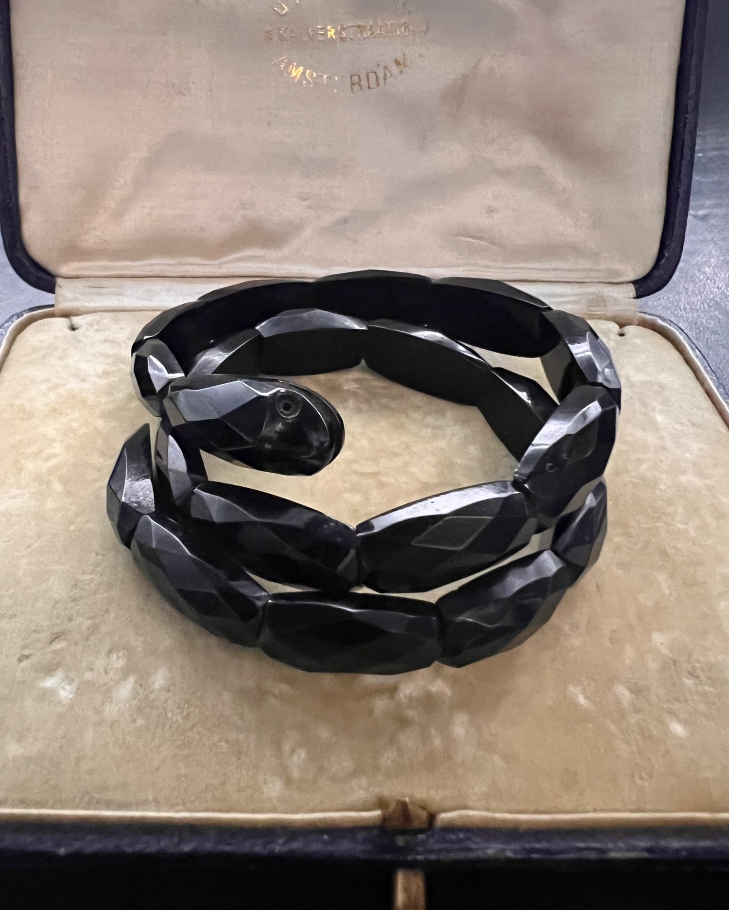 This is a gorgeous Victorian Whitby Jet snake bracelet.