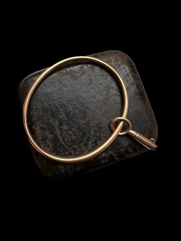 Made of solid gold, this late 19th century bangle is super modern in design; The simple oval bangle with a suspended chunky Bramah key.