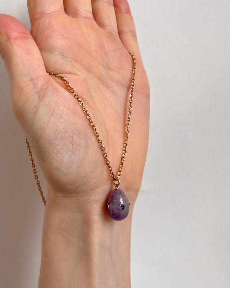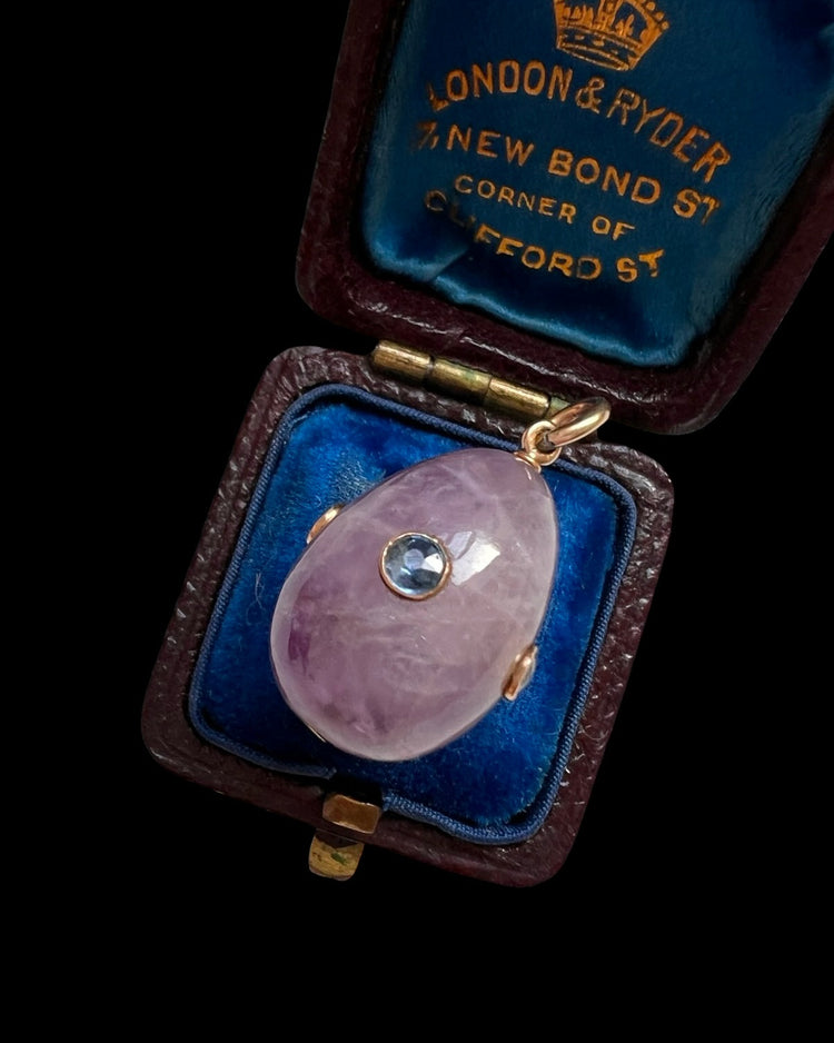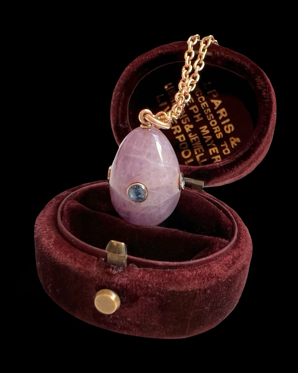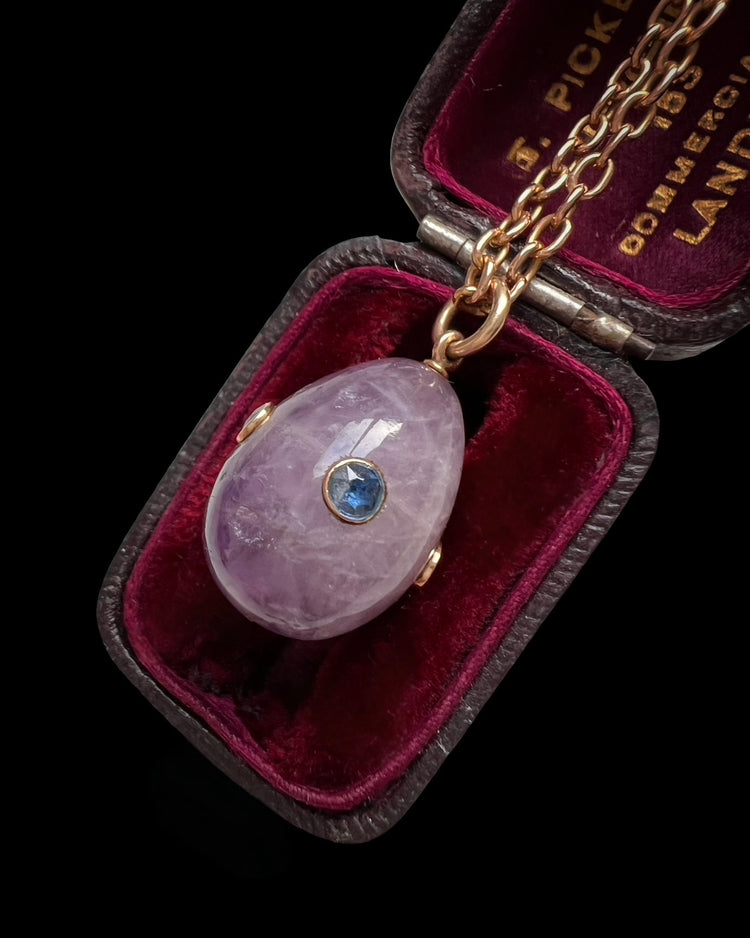 The egg is made of a lovely lilac amethyst, with four faceted blue sapphires set around the centre of the egg.