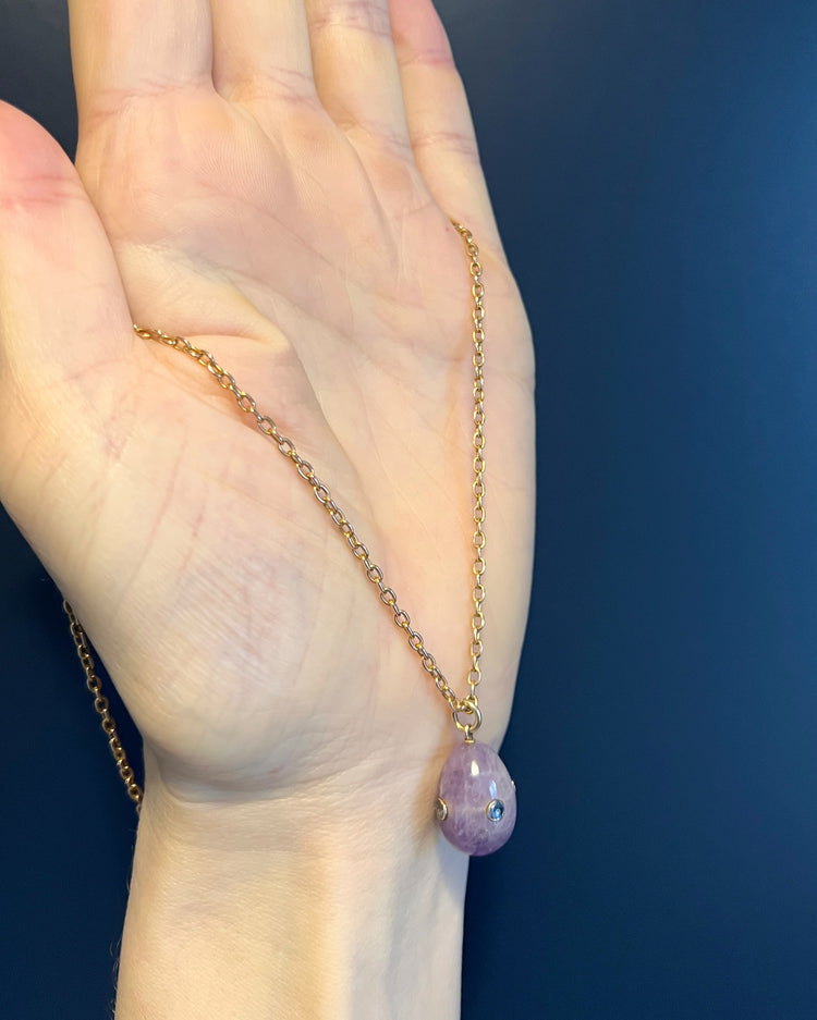 The egg has a pegged high carat bail, with a good size gold jump ring, making it easy to add to most chains.