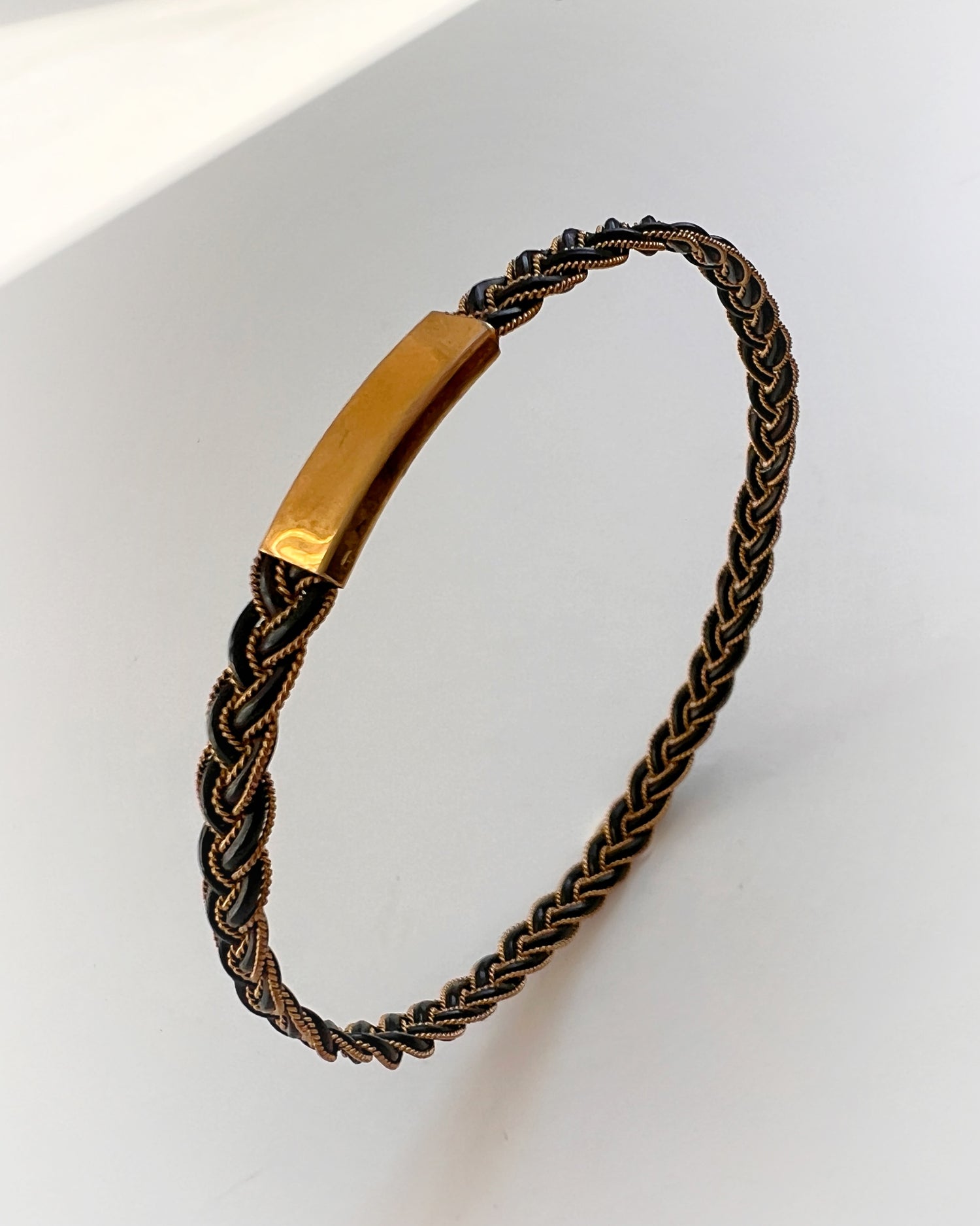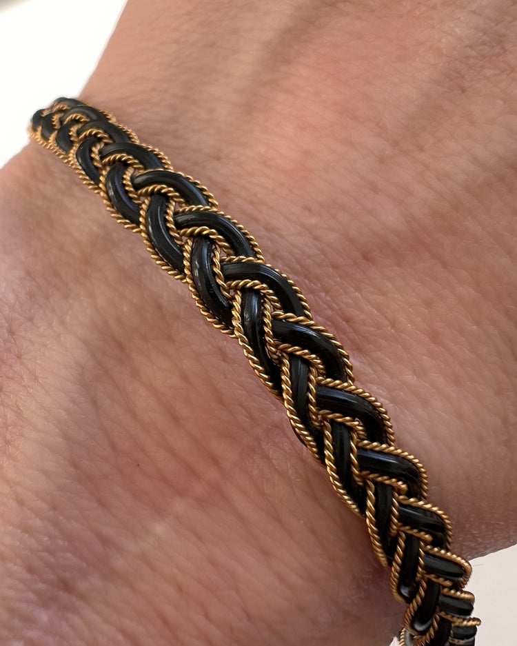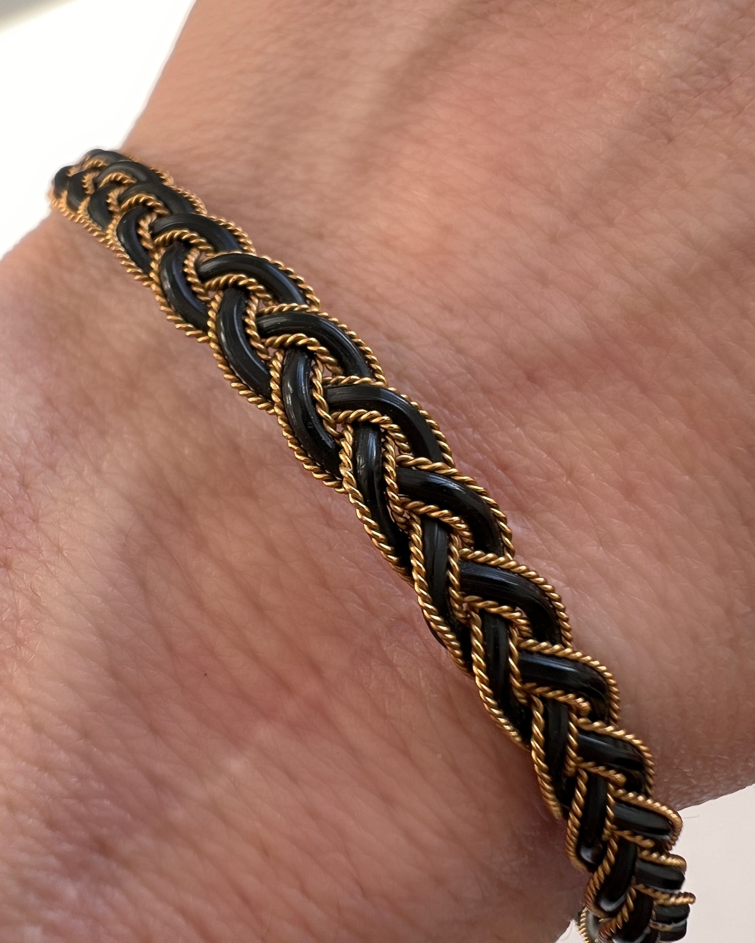 A gorgeous plaited elephant hair and 9ct gold bangle.