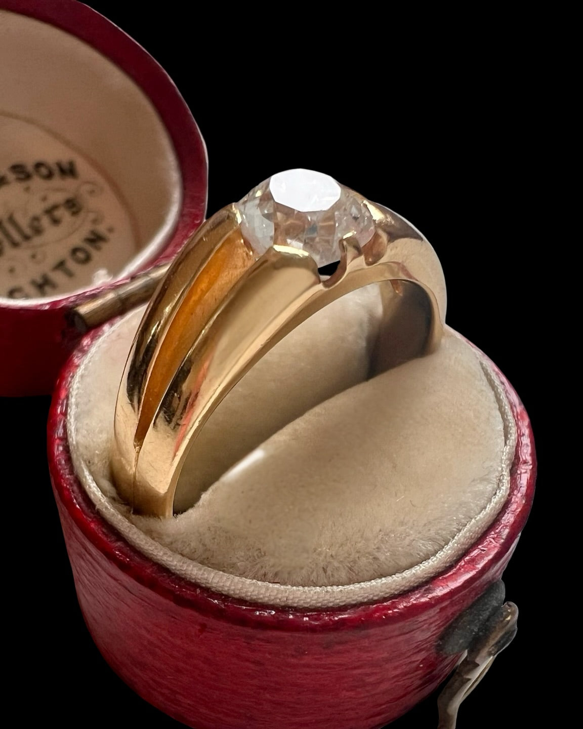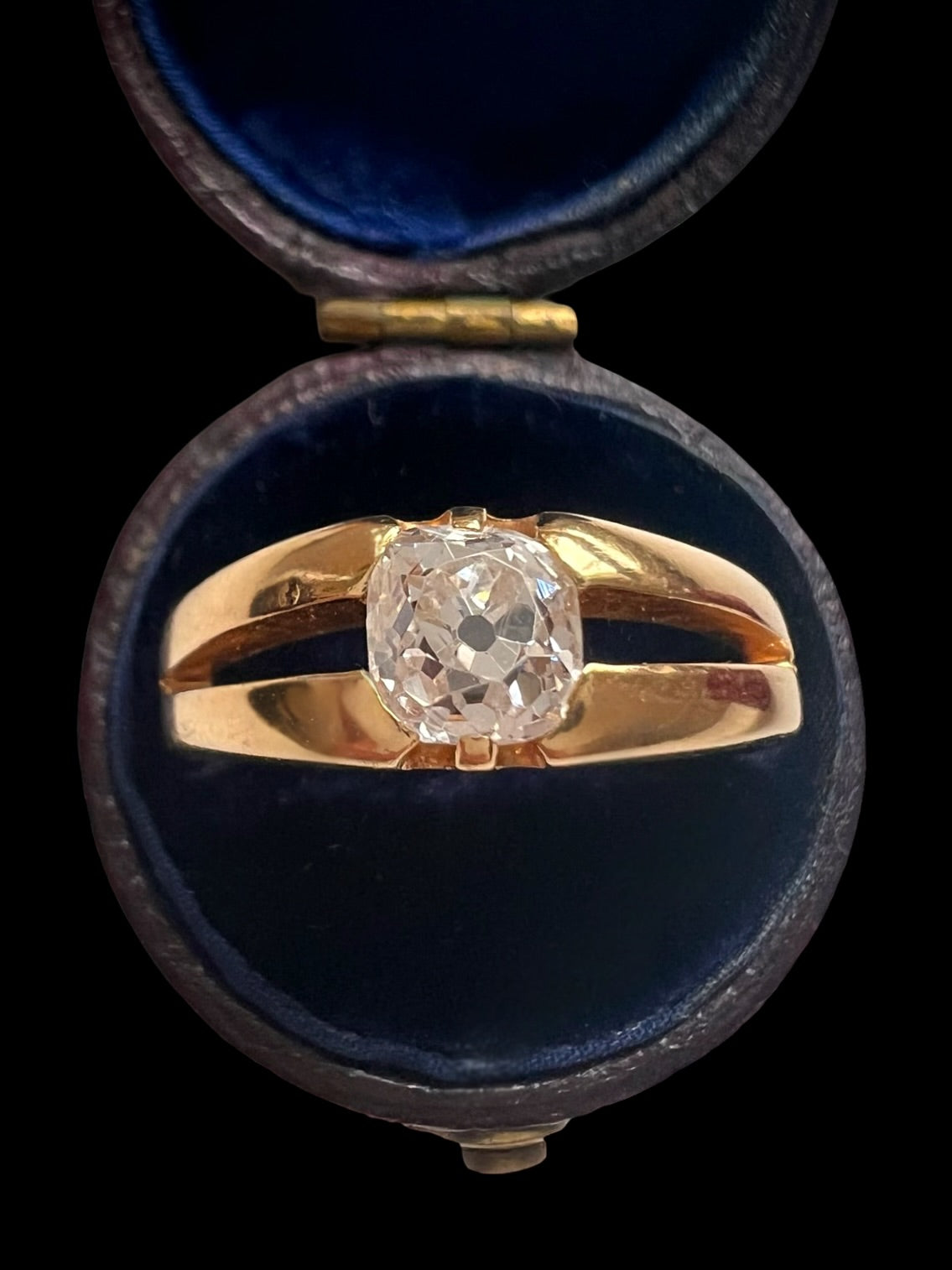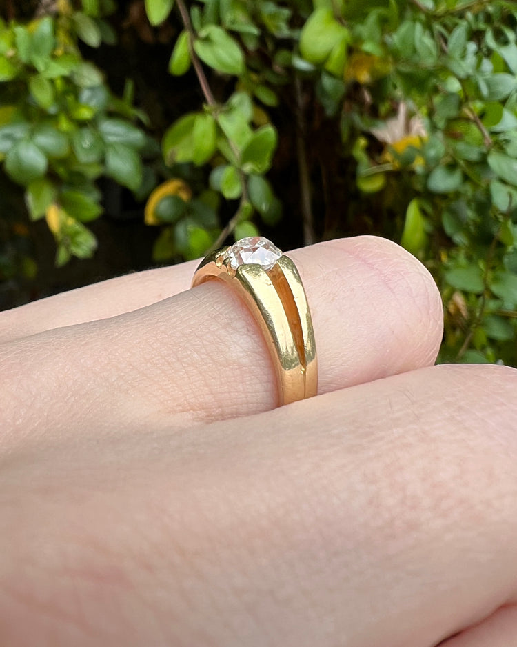 The ring is made of 18ct gold with a split shoulder band. Between the shoulders a fantastic quality old cut diamond is set in a chunky half claw setting.