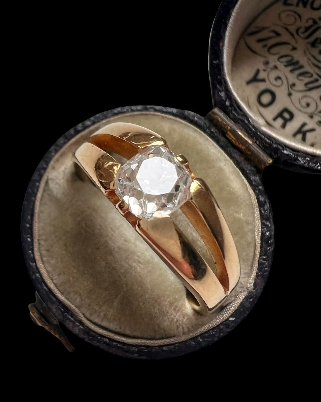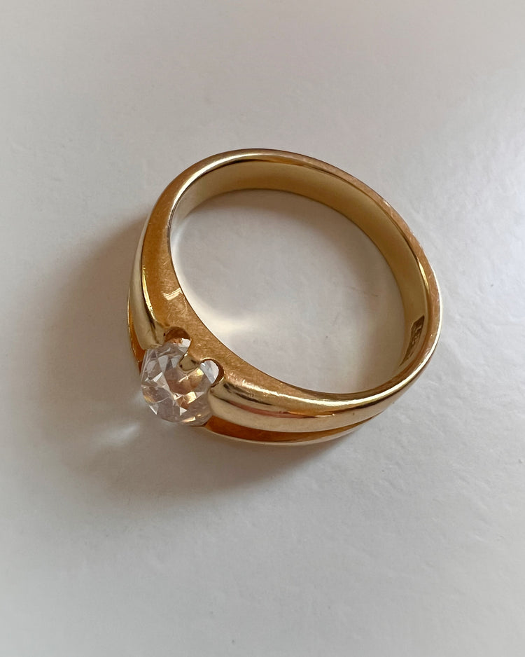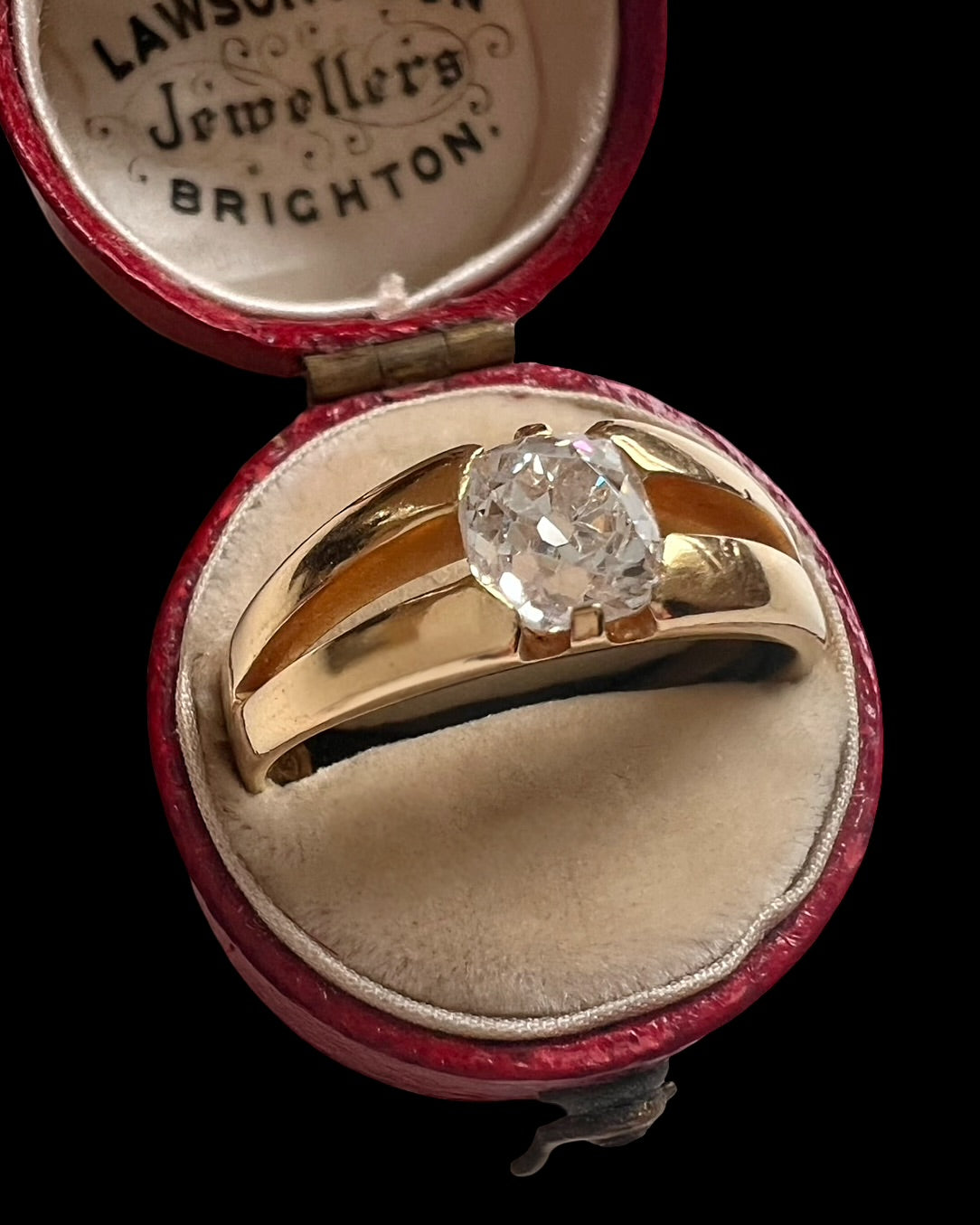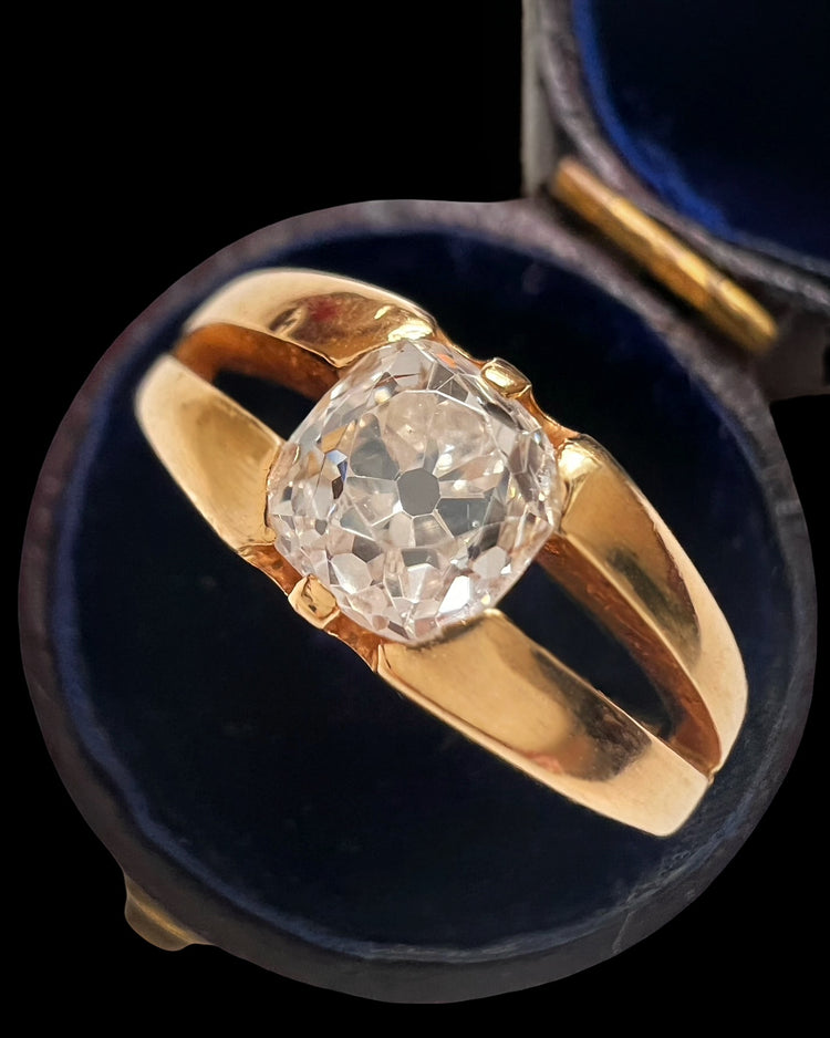 The ring is made of 18ct gold with a split shoulder band. Between the shoulders a fantastic quality old cut diamond is set in a chunky half claw setting.