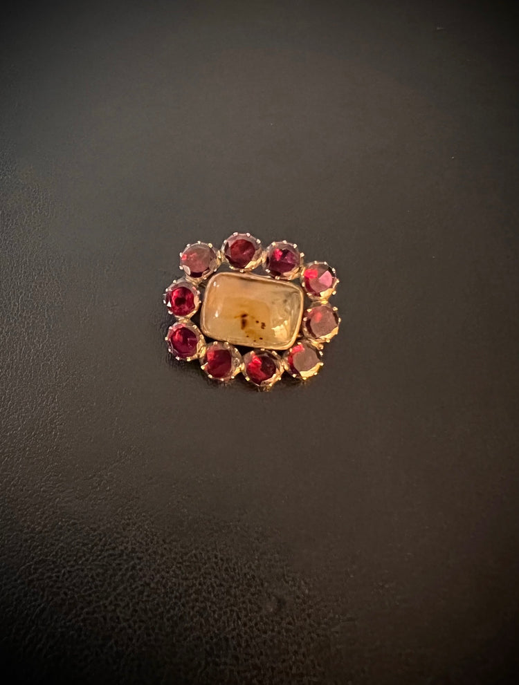 A beautiful Georgian Flat Cut Garnet and Moss Agate pendant/brooch with locket back.