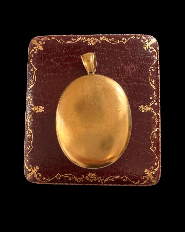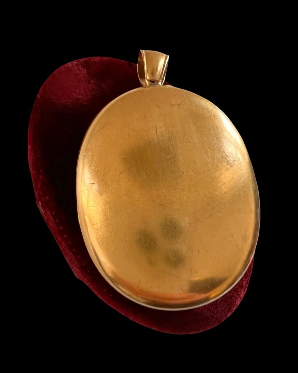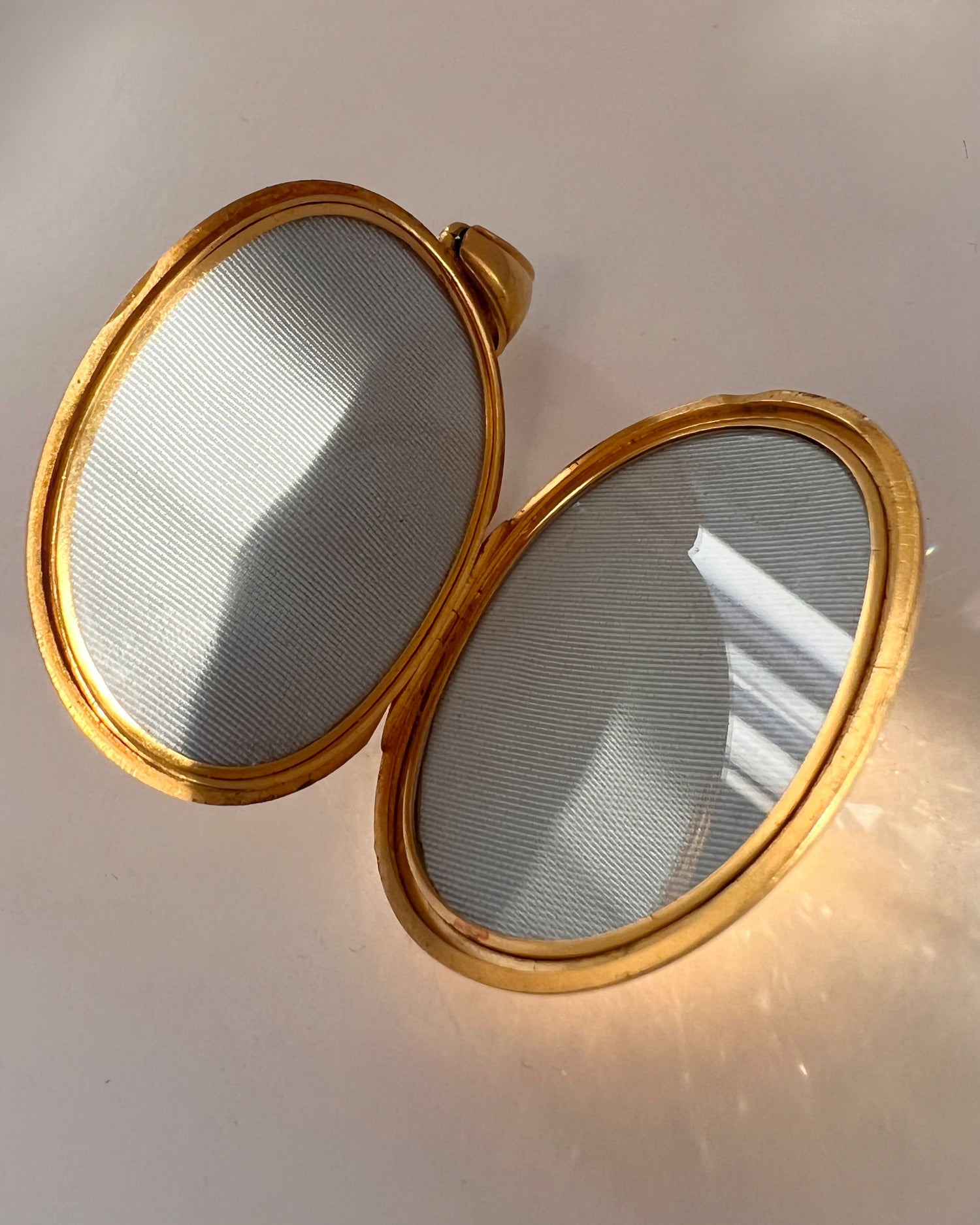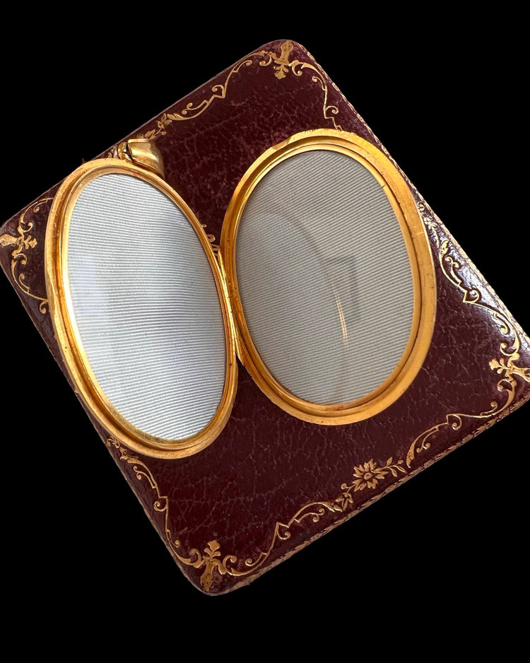 The locket opens to reveal two large glazed panels, currently lined in silk, and ready for your personal photos.