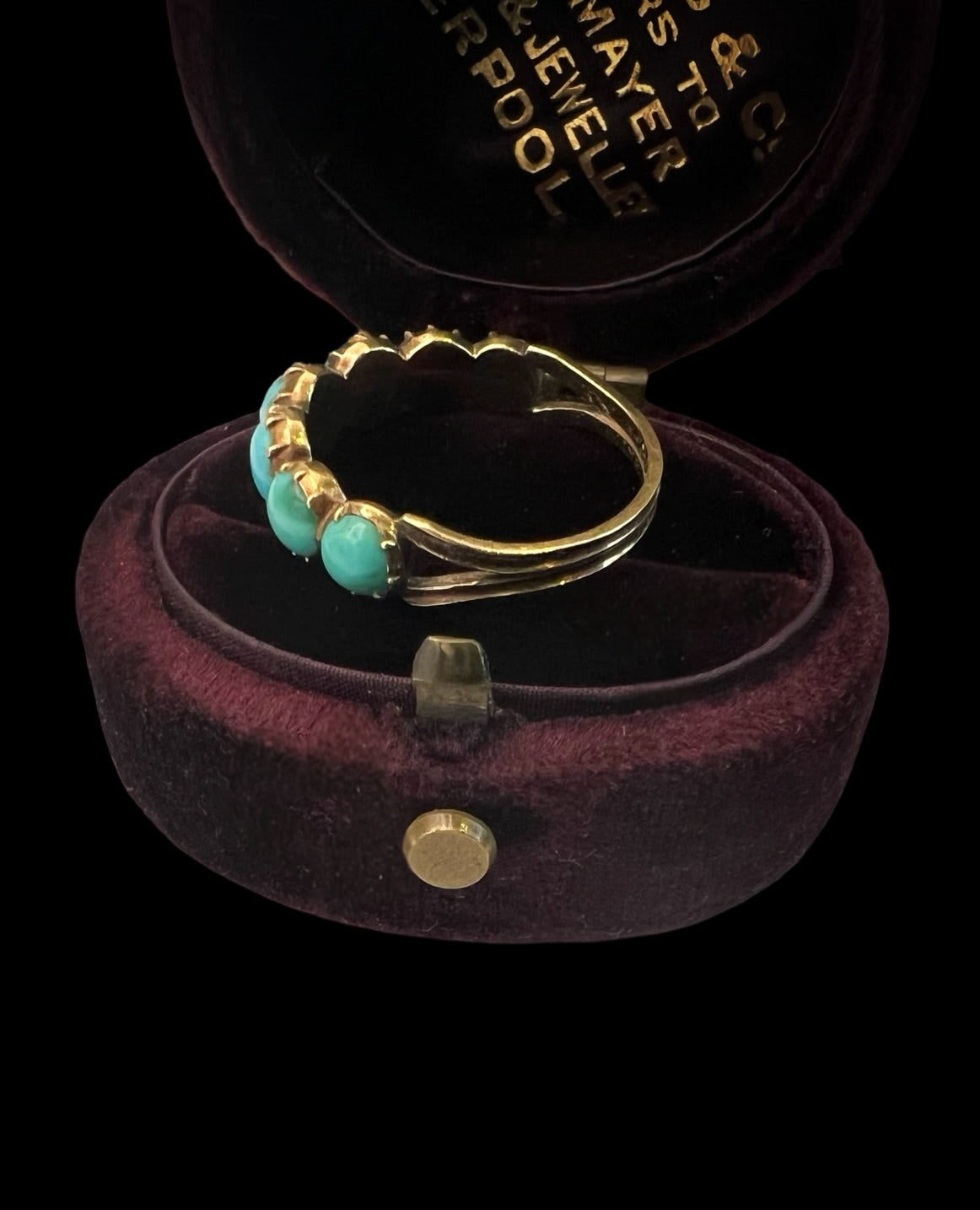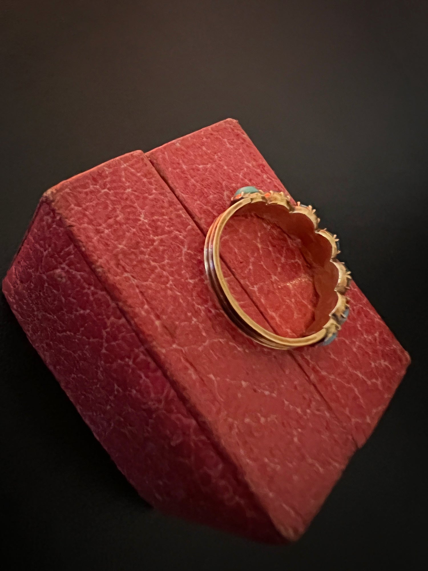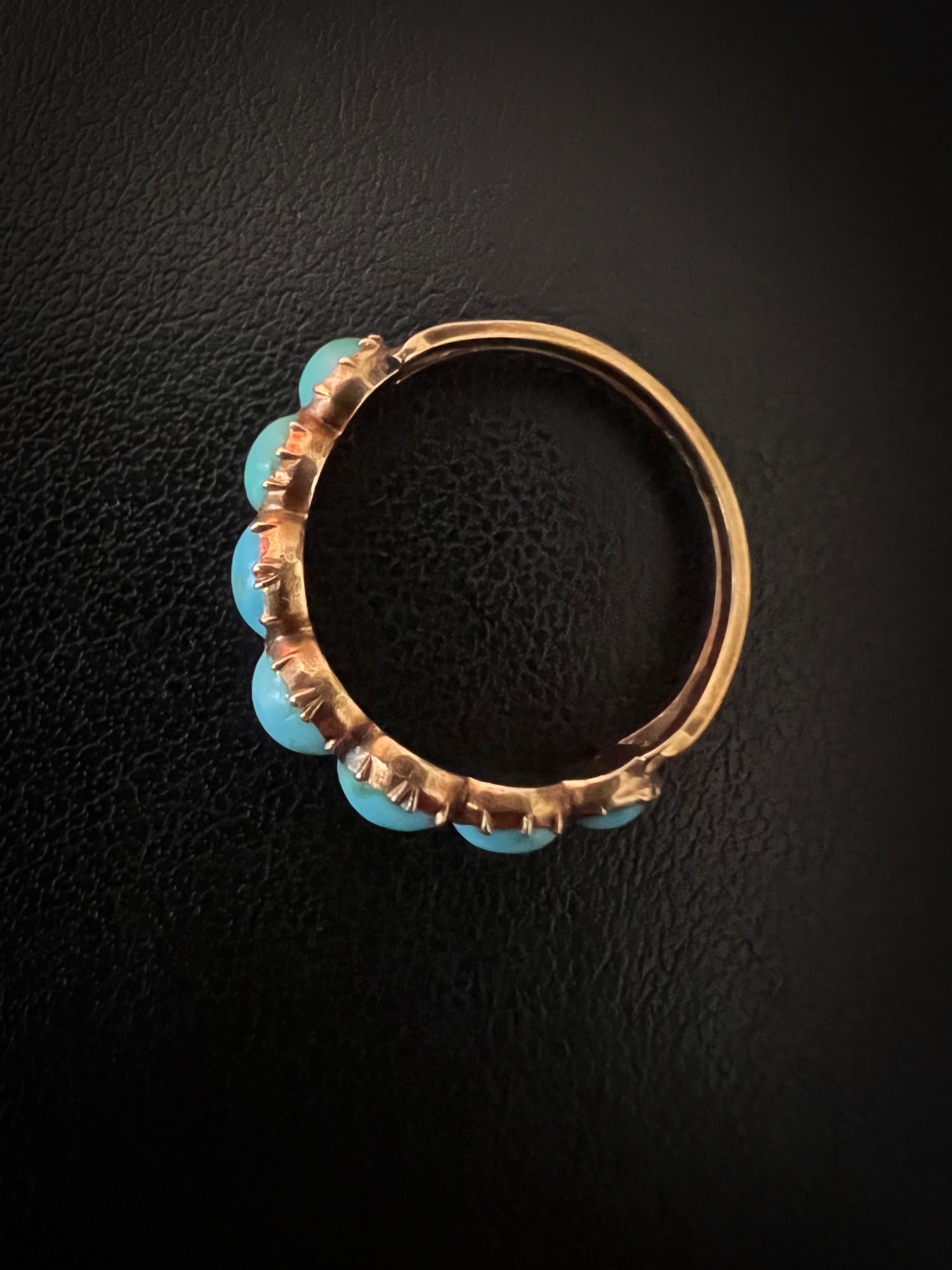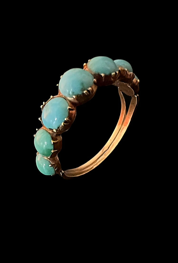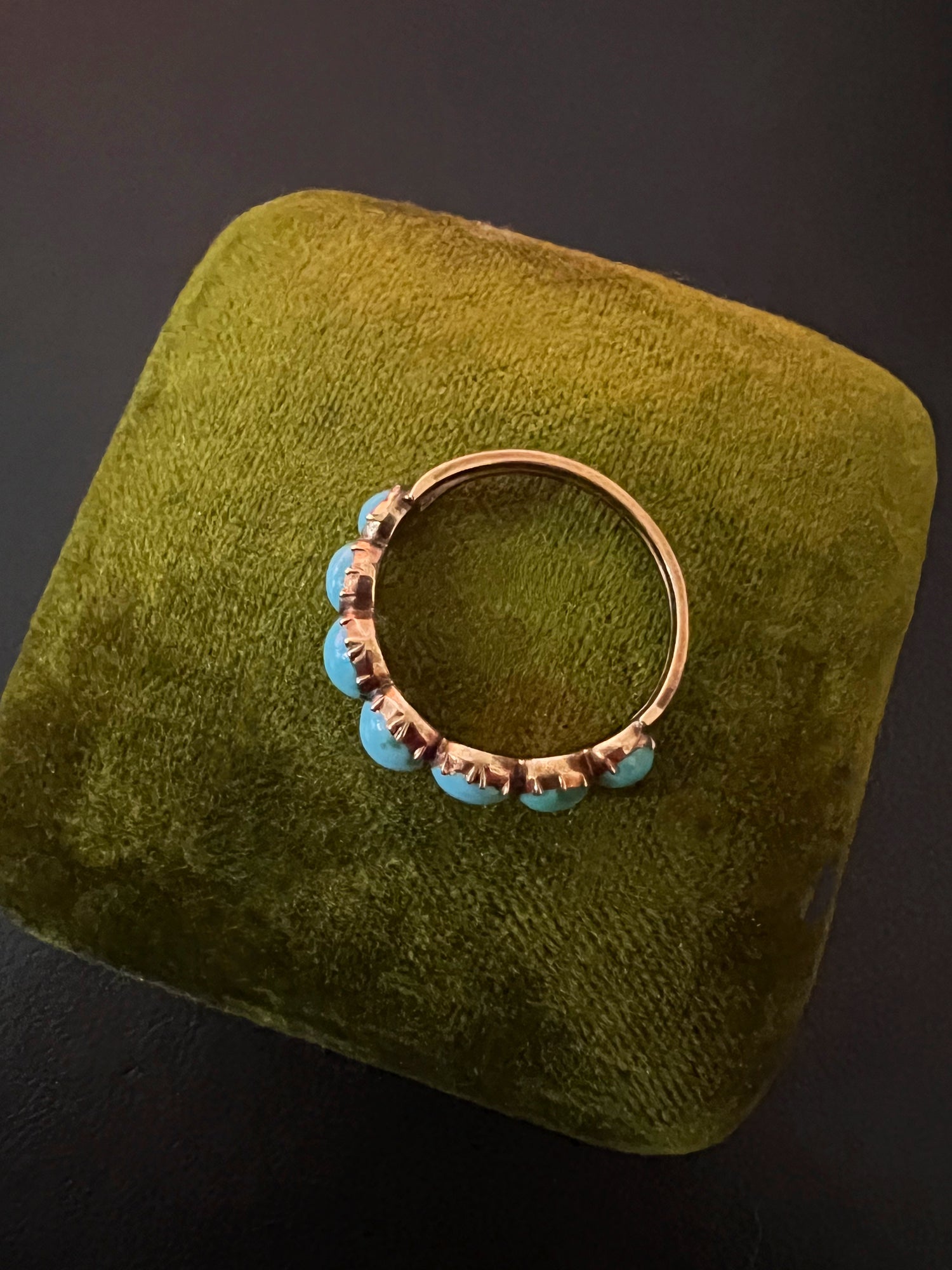 This is a gorgeous ring circa 1830, set with seven cabochon Turquoise stones in a high carat gold closed back setting.