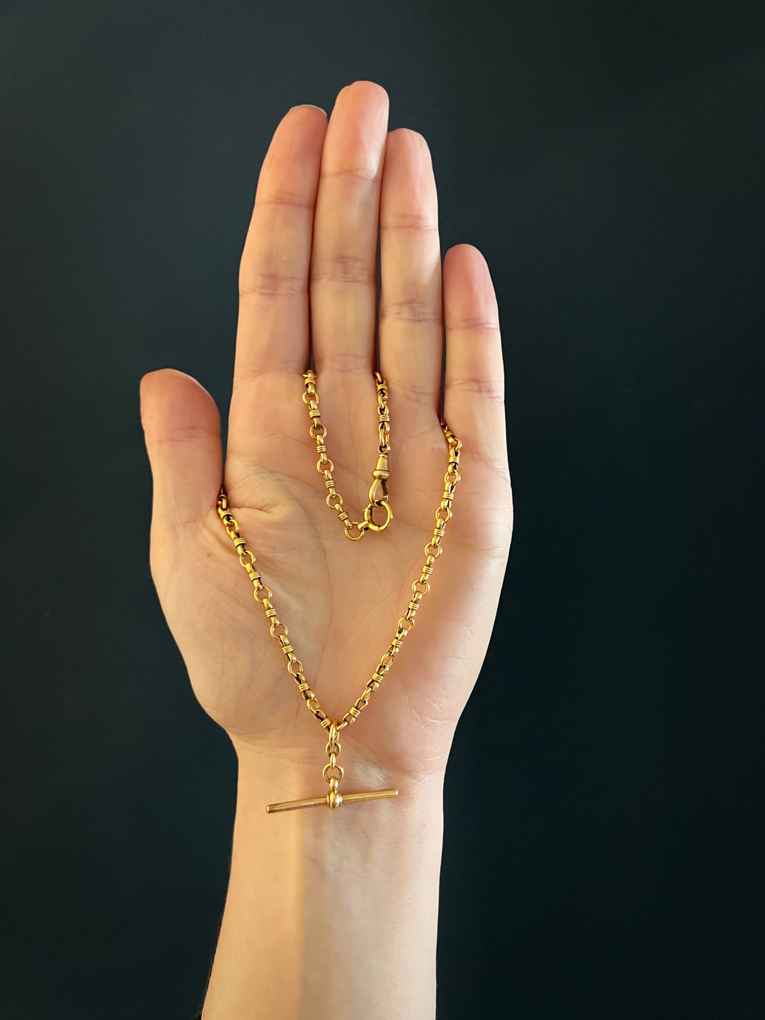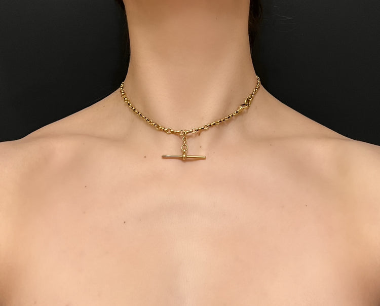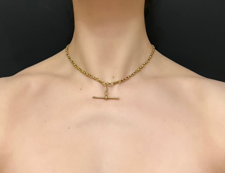 A gorgeous 15ct gold fancy link T-bar chain with a chunky bolt ring and dog clip fastening.