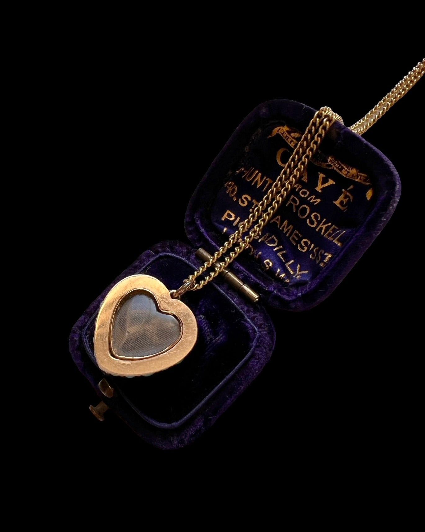 The reverse of the pendant is gold with a central heart shaped locket, with the original black silk lining.