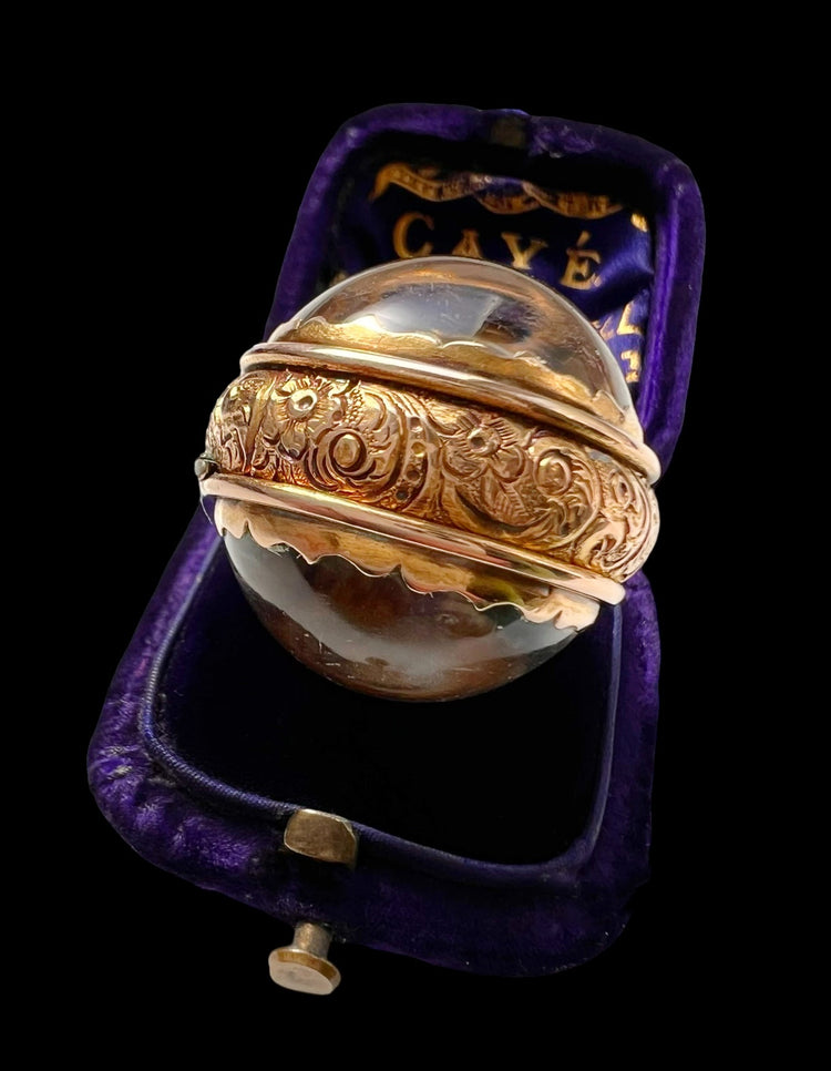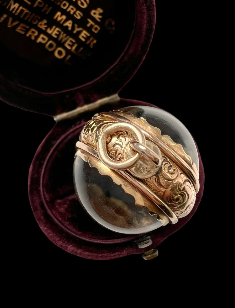 The high domed rock crystals are set in a thick 15ct gold frame that has gorgeous foliate chasing.