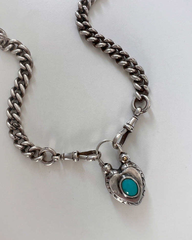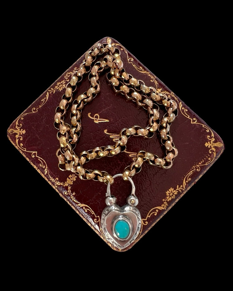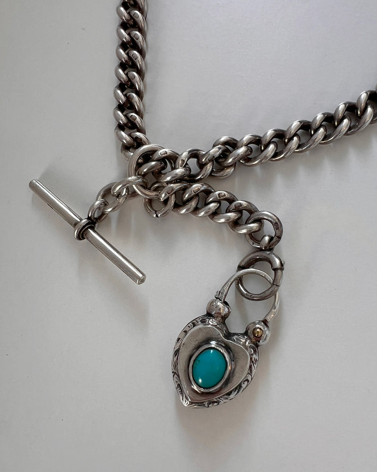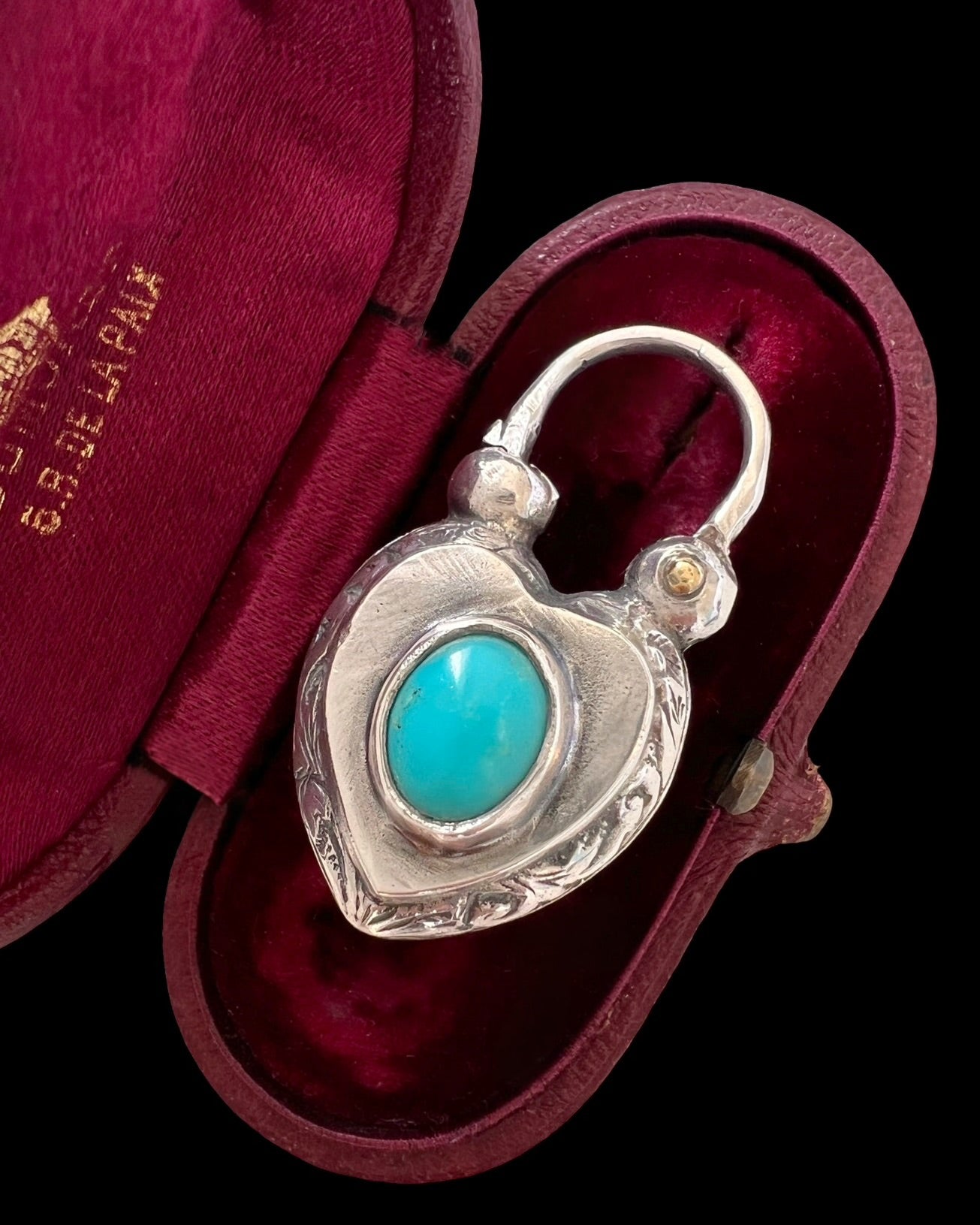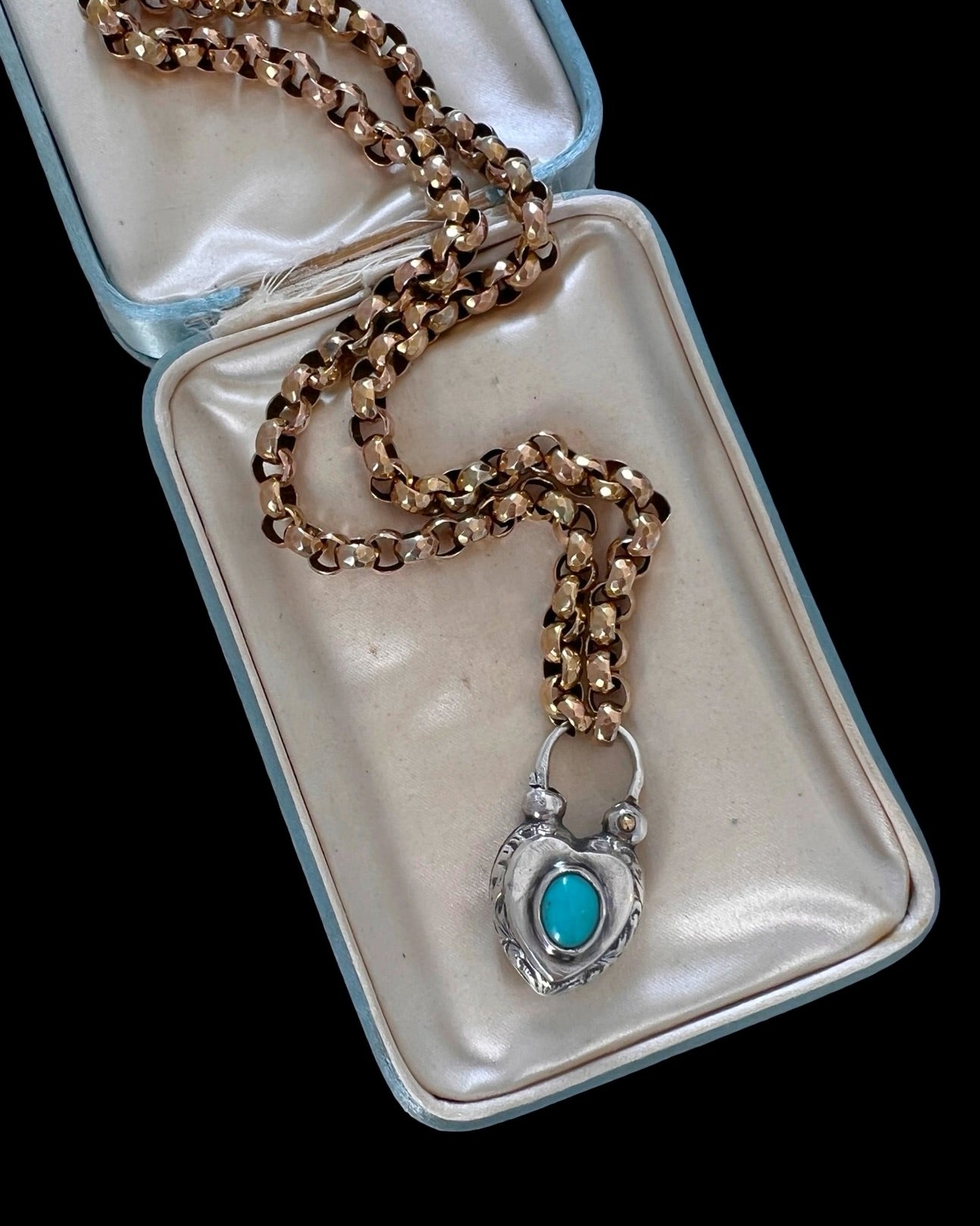 Circa 1880, the padlock has a large cabochon turquoise stone in the centre, and the silver has a lovely foliate chasing on the side and back of the heart.