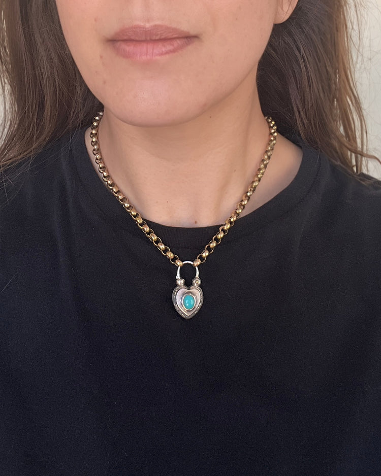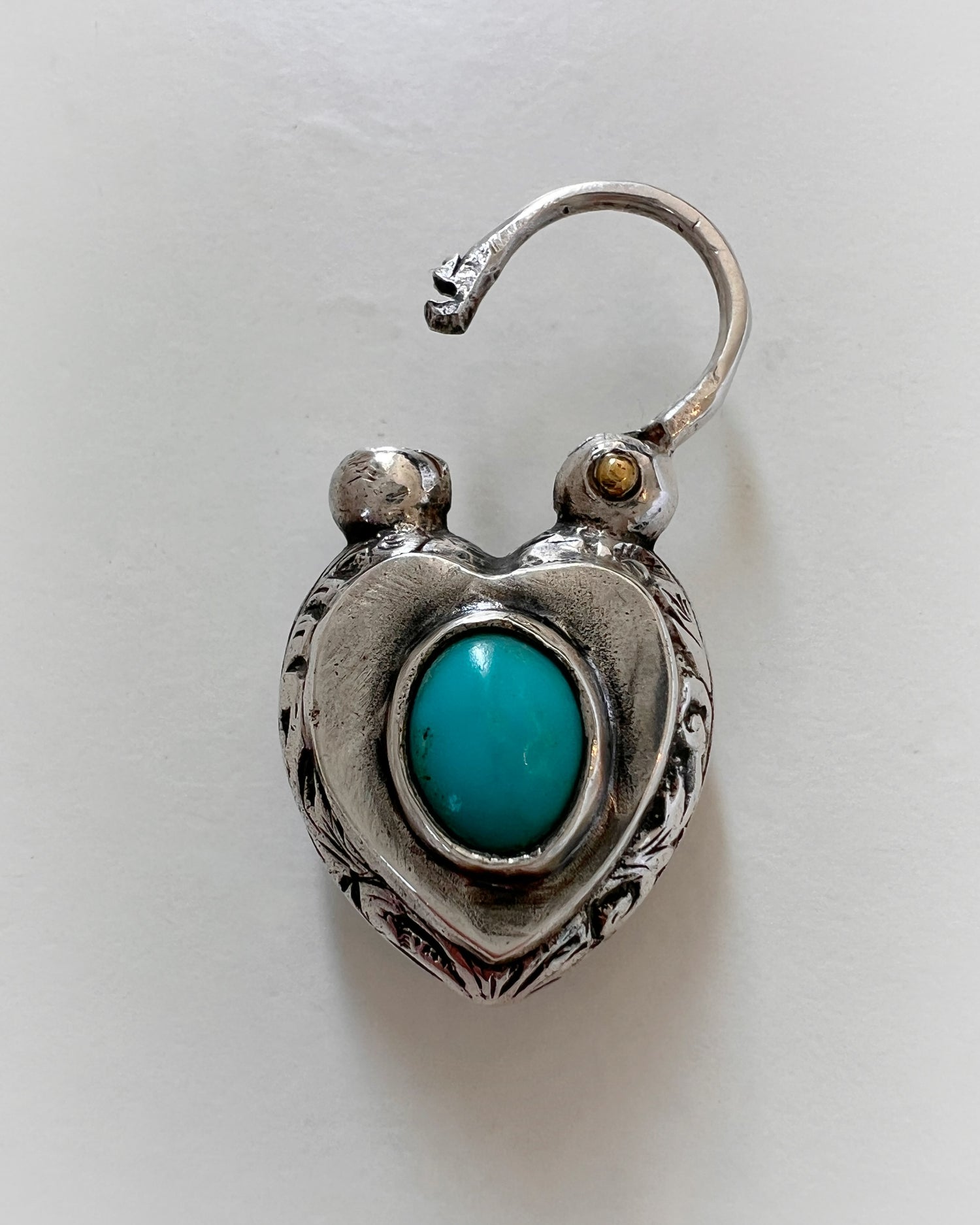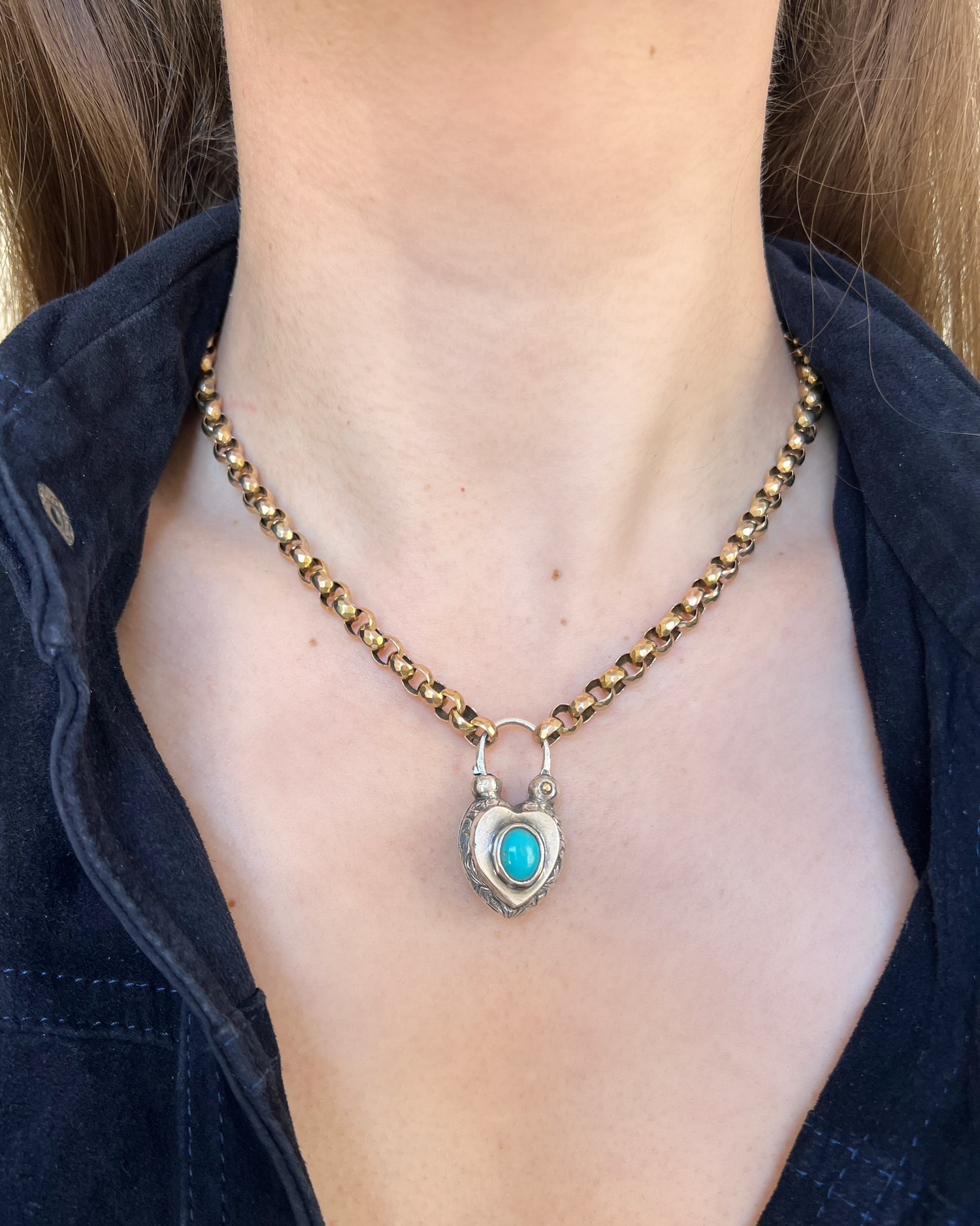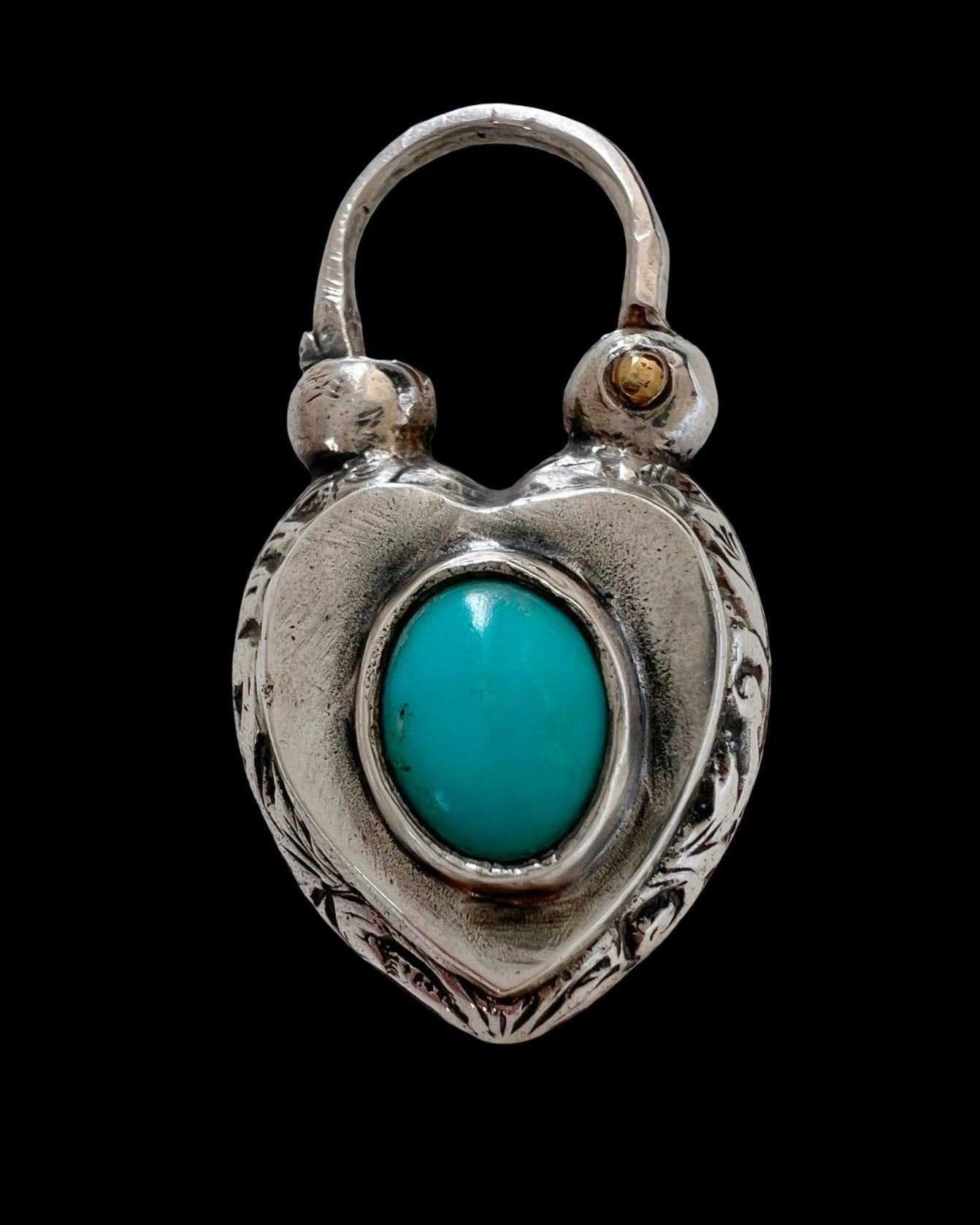 Circa 1880, the padlock has a large cabochon turquoise stone in the centre, and the silver has a lovely foliate chasing on the side and back of the heart.