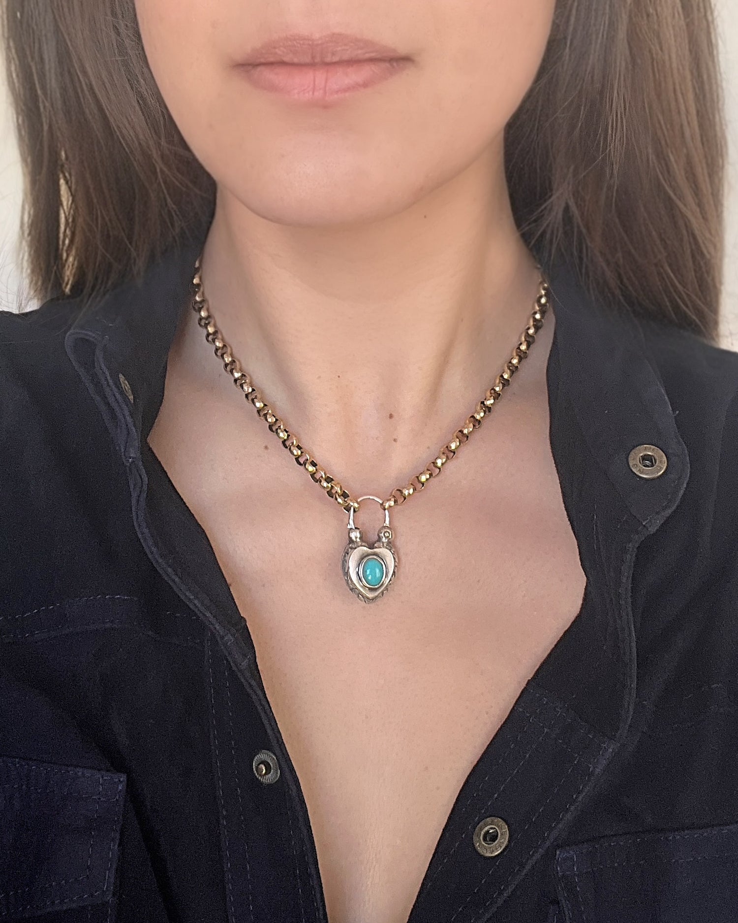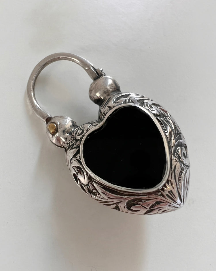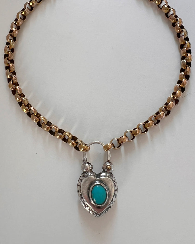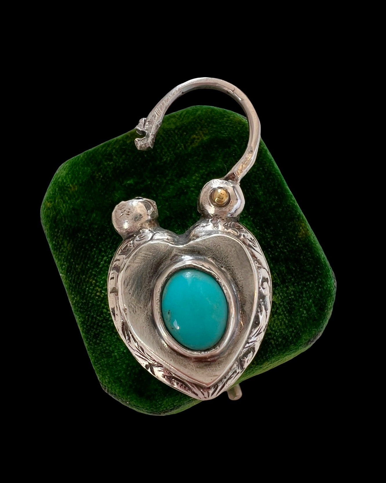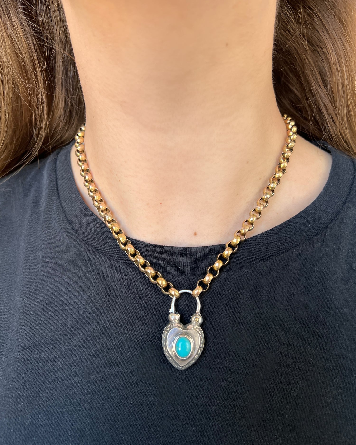 Circa 1880, the padlock has a large cabochon turquoise stone in the centre, and the silver has a lovely foliate chasing on the side and back of the heart.