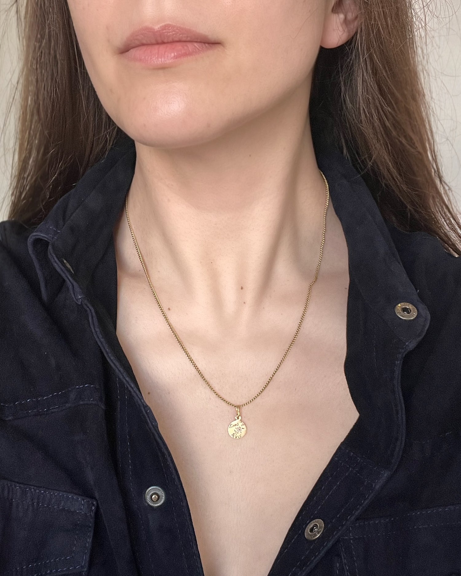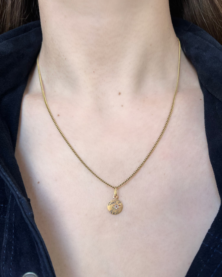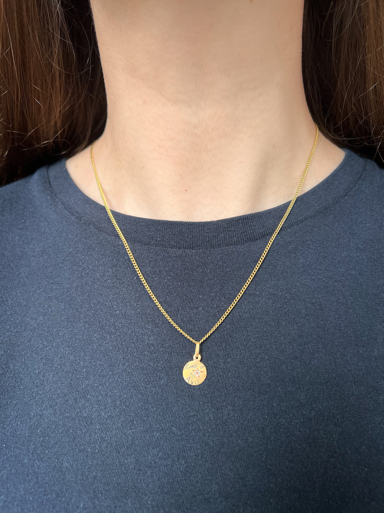 The mini disc pendant has an enamel ‘Forget-me-not’ flower, and the words;